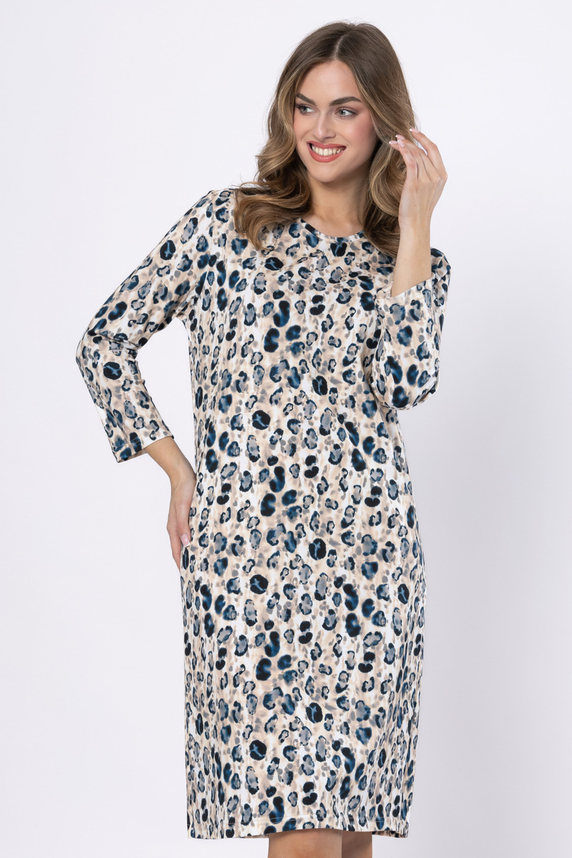 Жіноча сорочка WITALIA 1665 від Leveza – це преміальна пропозиція, розроблена для жінок, які цінують елегантність, комфорт та найвищу якість. Виготовлена зі 100% рафінованої бавовни, вона забезпечує виняткову м'якість, довговічність та комфорт як для денного, так і для нічного носіння. Вона має круглий виріз горловини та модну довжину 7/8, яка ніжно підкреслює силует і додає легкості. Леопардовий принт бежевого та темно-синього кольорів надає сорочці вишуканого, сучасного вигляду. Довжина до коліна робить її ідеальною нічною сорочкою або стильним одягом для дому для жінок, які люблять почуватися особливими завжди.