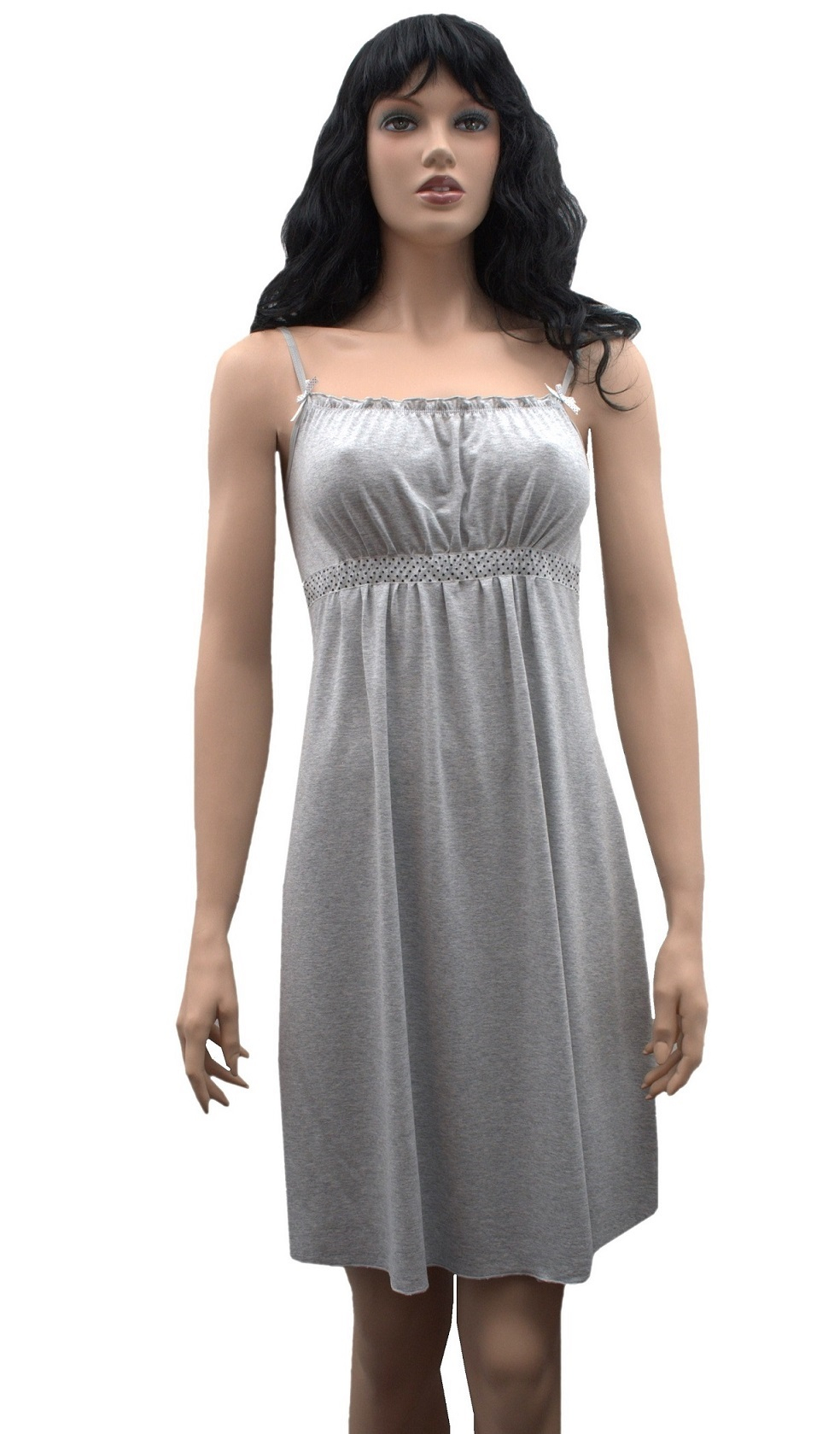 Жіноча футболка з високоякісної 94% віскози з 6% еластану, на вузьких регульованих ремінцях. Декольте декоровано бантами і ніжними воланами. Під бюстом є вставка з маленькими крапками.