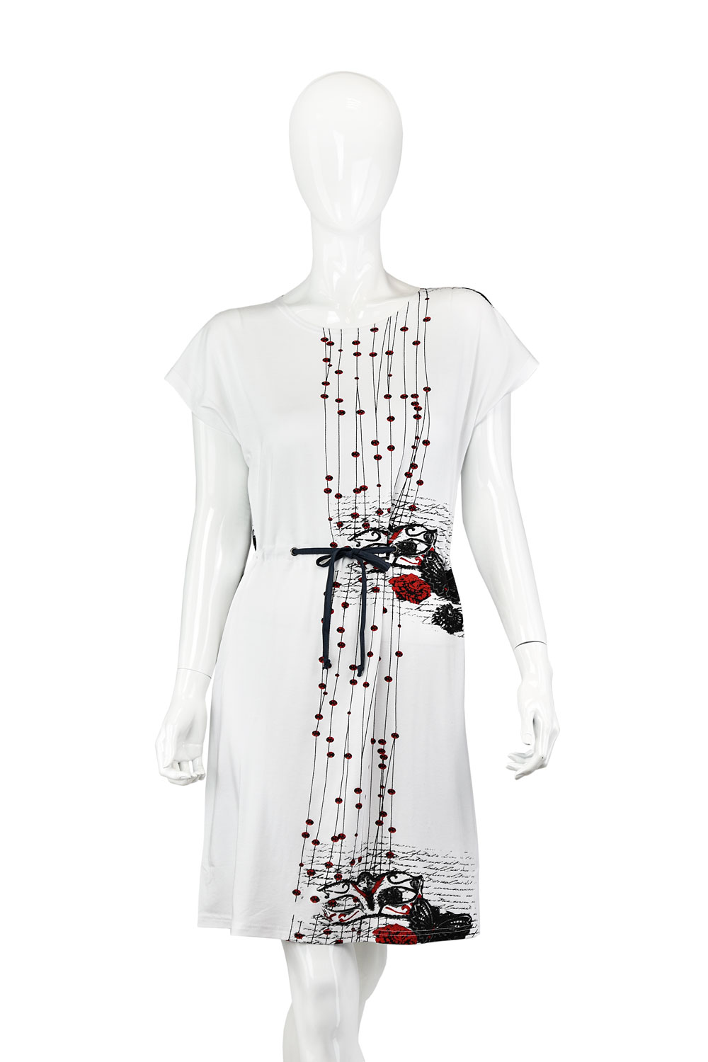 Жіноча нічна сорочка з коротким рукавом. Виконана з віскозного в’язання вільного крою. Прикрашена строкатим візерунком і зав'язана на талії. Склад: 94% віскоза, 6% еластан.