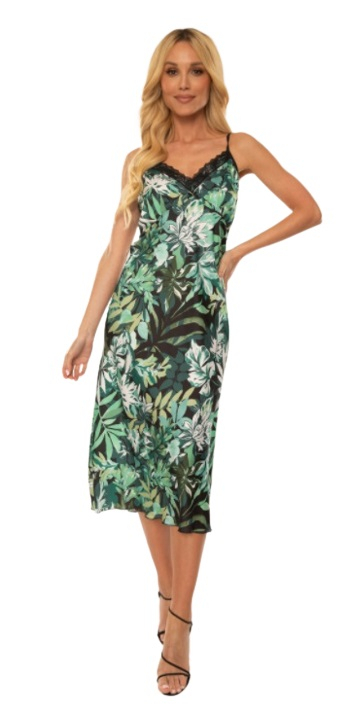 Красива, повітряна і ніжна довга жіноча сорочка. Виготовлений з атласу з красивим зеленим квітковим візерунком. Футболка з вузькими регульованими бретелями Склад: 97% поліестер, 3% еластан.