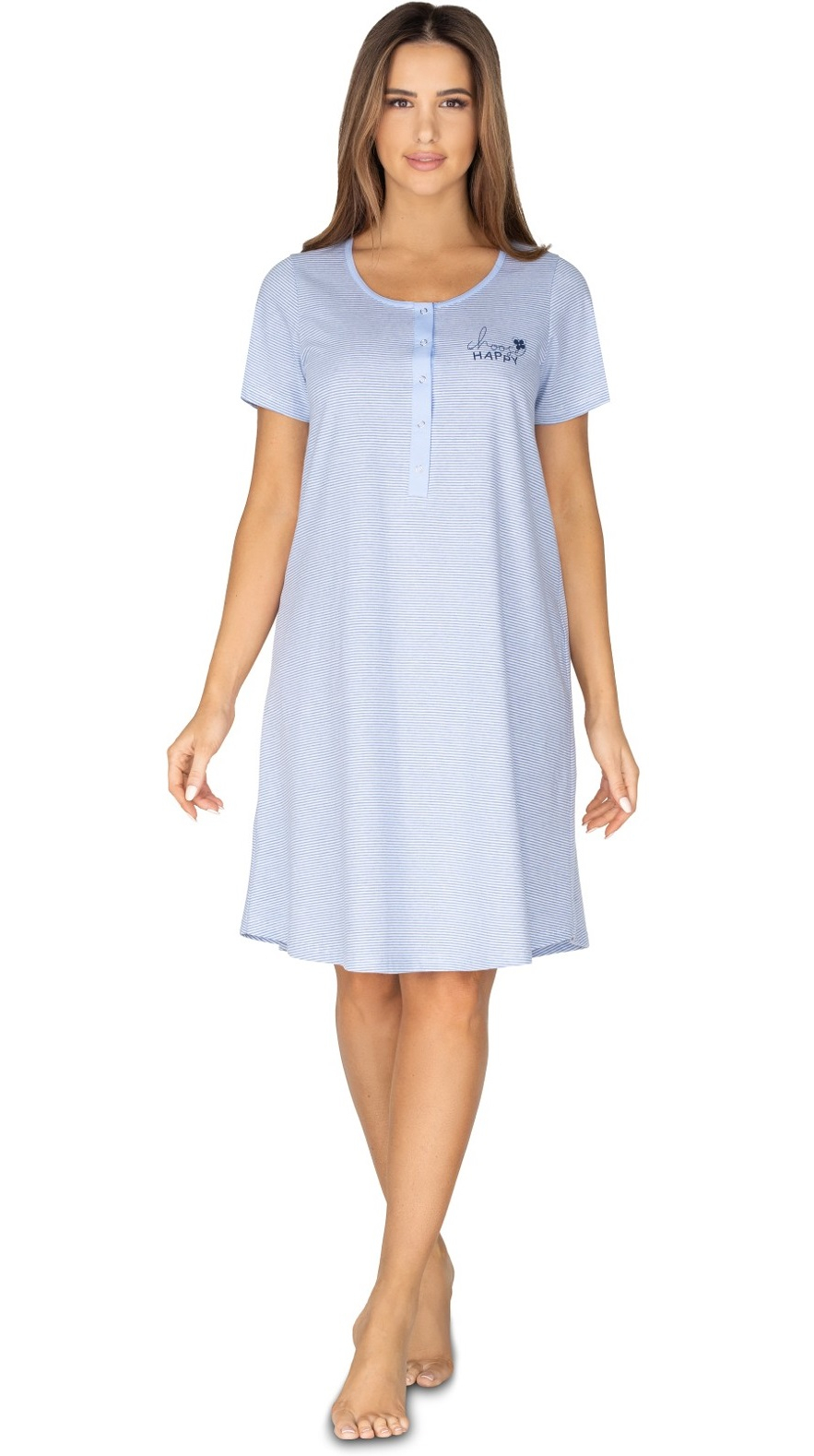 Жіноча нічна сорочка з ніжної бавовни в смужку, декорована аплікацією. Круглий виріз, застібається на застібки. Склад: 100% бавовна.