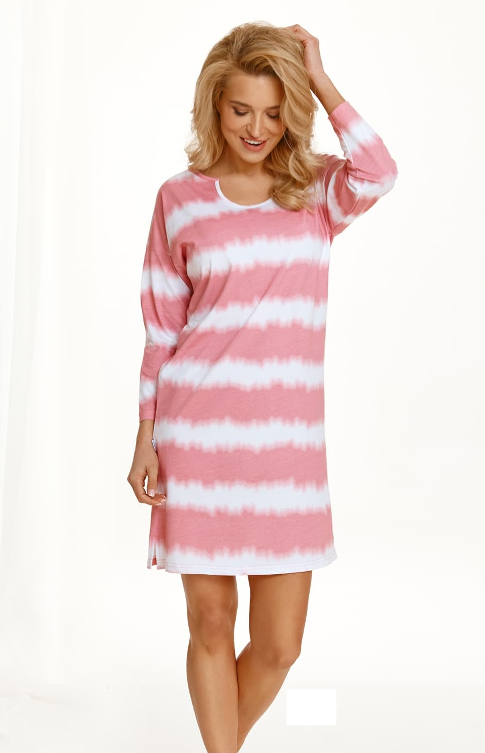 Нічна сорочка з довгим рукавом. Виготовлений з ніжної бавовни. Вільний, зручний крій, вигадливо вирізаний виріз. Довжина вище коліна. Склад: 100% бавовна.