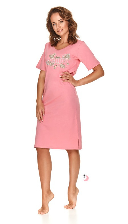 Нічна сорочка з високоякісної бавовни. Рукава короткі, довжиною до коліна, спереду прикрашені аплікацією. Склад: 100% бавовна.