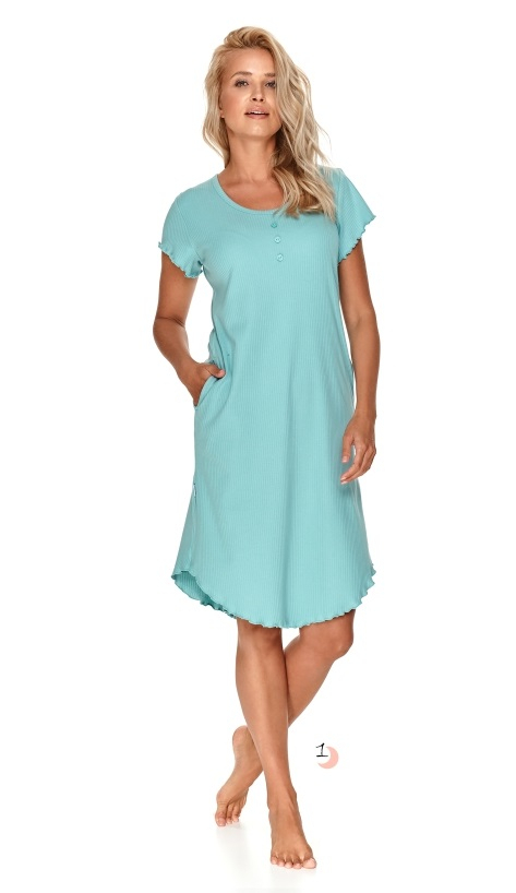Нічна сорочка з високоякісної бавовни. Рукава короткі, прикрашені вшитими гудзиками, рукав у вигляді оборки. Склад: сірий: 95% бавовна, 5% поліестер, м'ята: 100% бавовна.