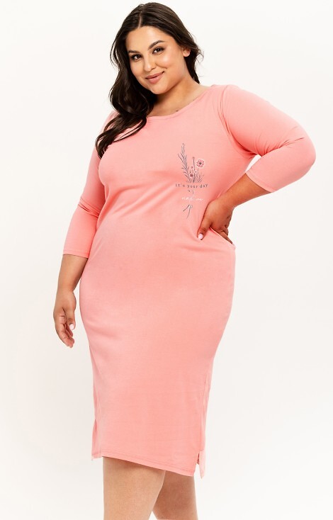 Жіноча бавовняна сорочка з ніжним квітковим принтом на грудях. Круглий виріз, рукав 3/4. Довжина до коліна, розрізи внизу. Склад: 100% бавовна.