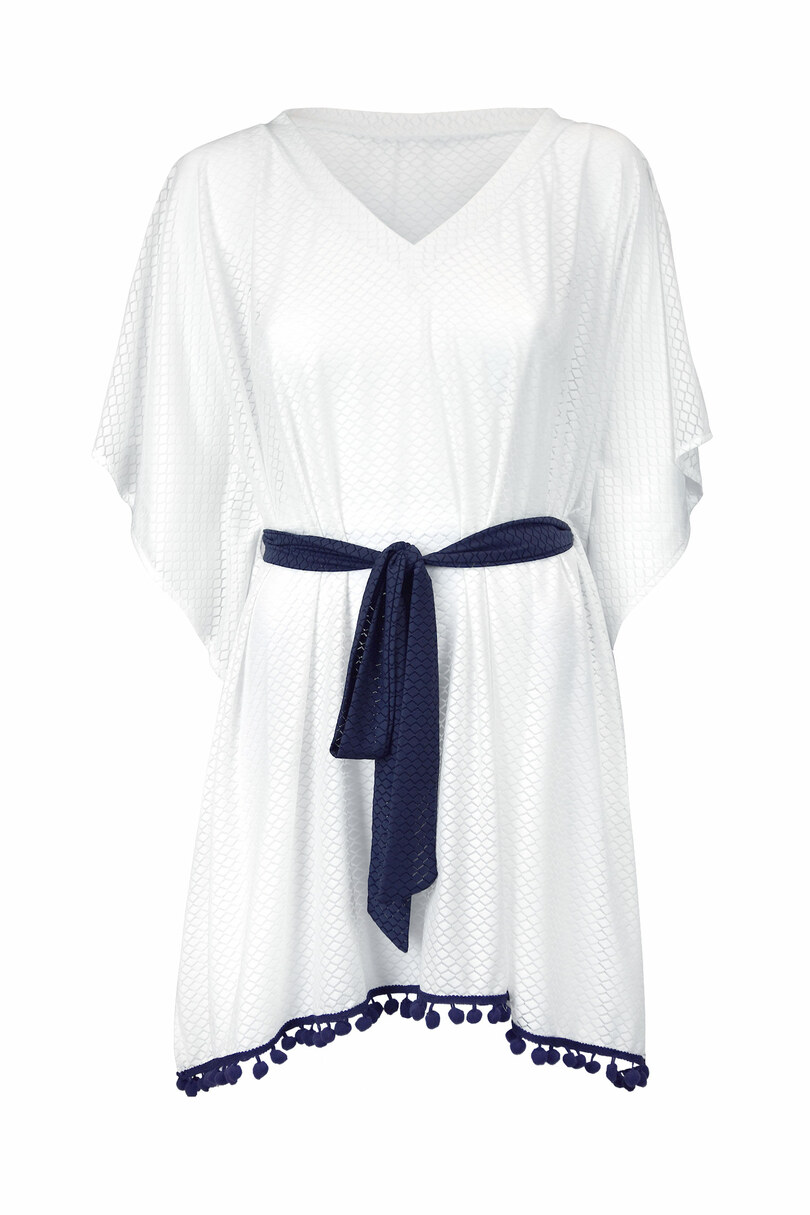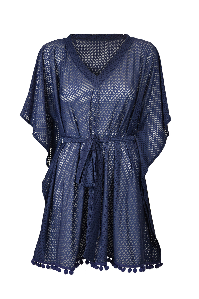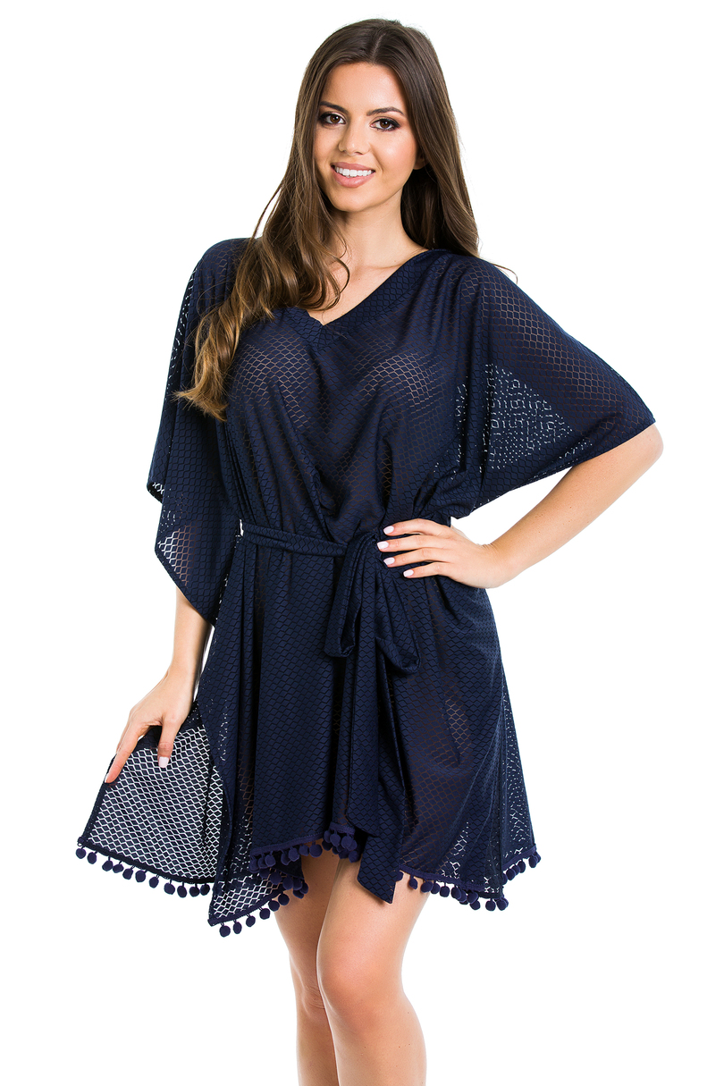 Це парео виготовлене з ніжної, злегка прозорої тканини, оздоблене темно-синьою обробкою з бісеру по краю. Склад: 90% поліамід, 10% еластан.