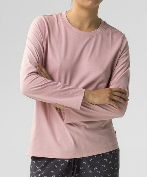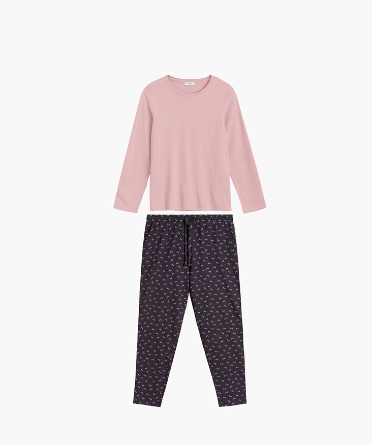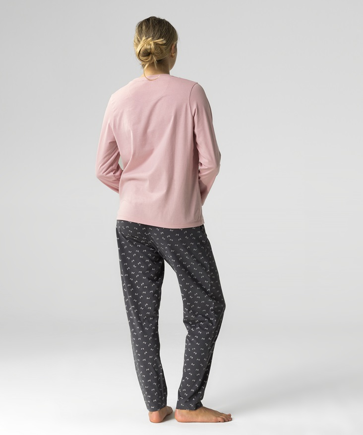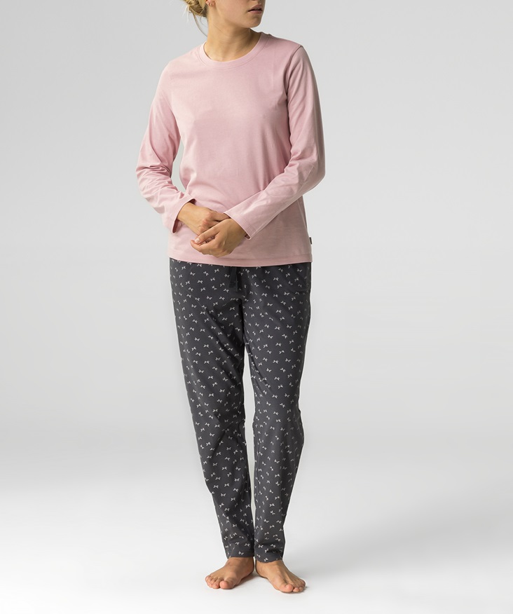 Піжама з гладким, м'яко приталеним топом з довгими рукавами та довгими, вільними штанами з бантами. Тканина також вкрита дрібним ворсом (так званий персиковий ефект). Склад: 100% бавовна.