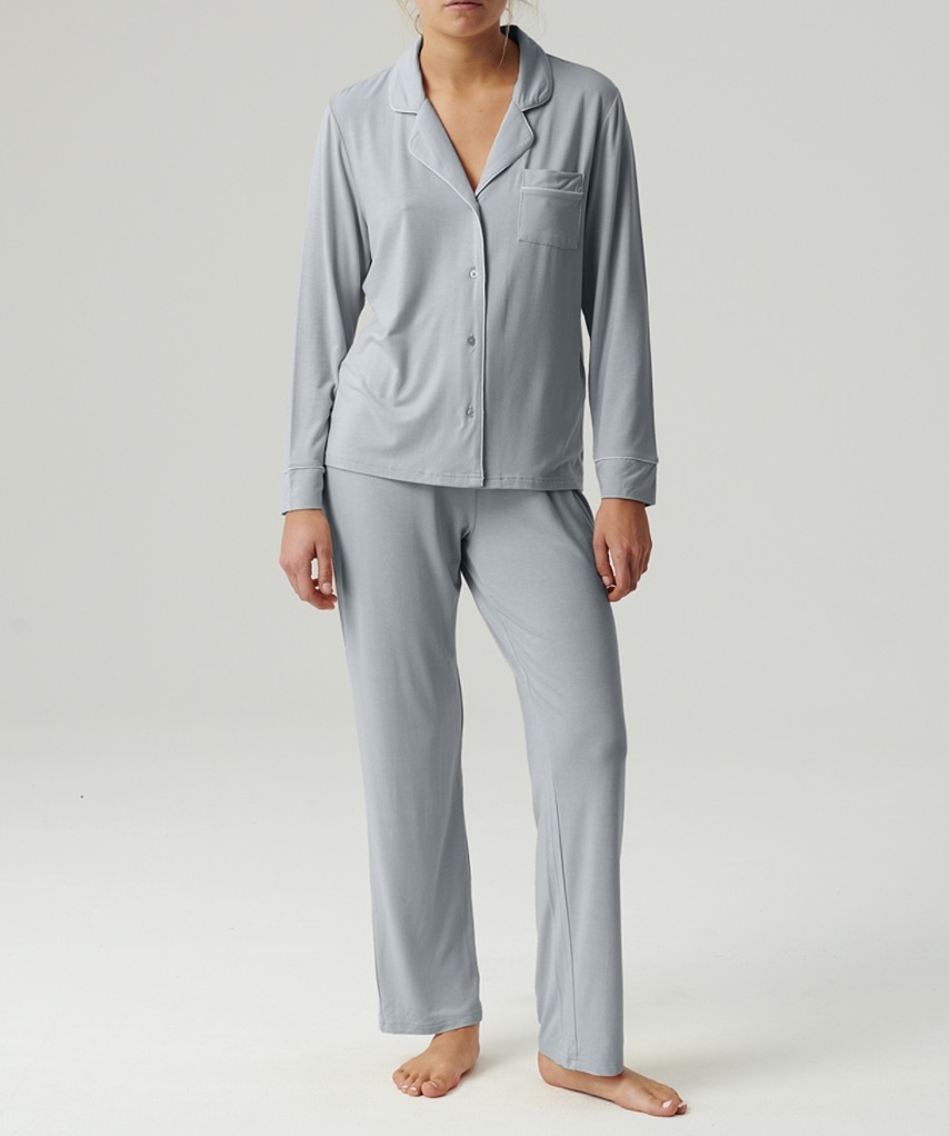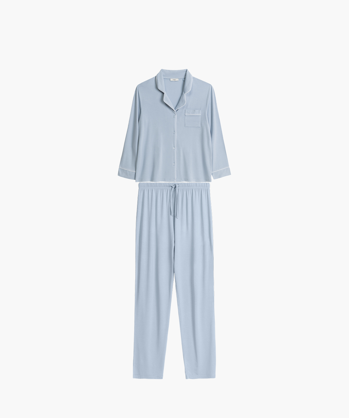 Жіноча піжама з легкого, ніжно мерехтливого модалу, надзвичайно м'яка, дихаюча та приємно прохолодна на дотик. Блузка з довгими рукавами на ґудзиках та брюки прямого крою. Склад: 95% модал, 5% еластан.