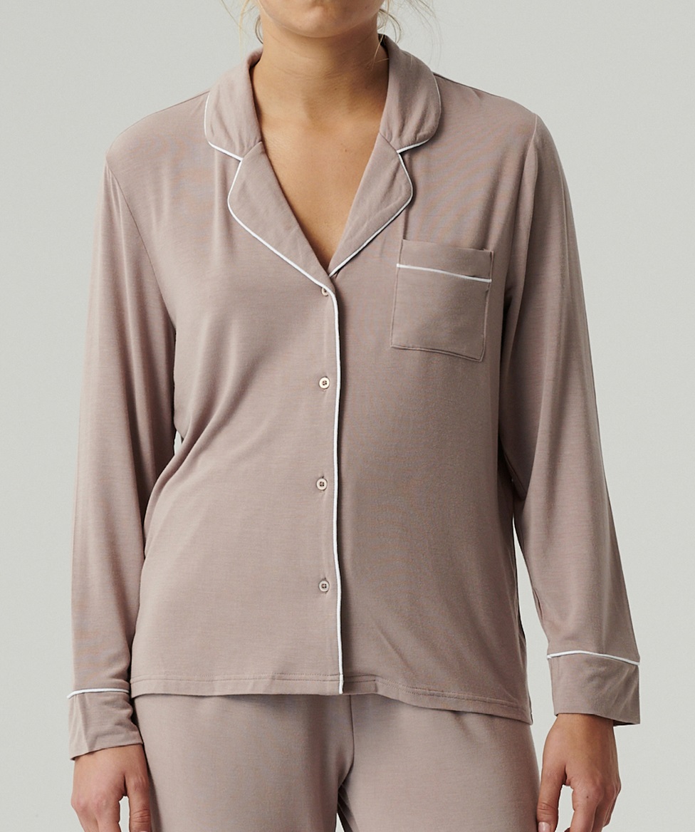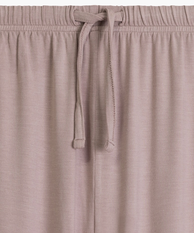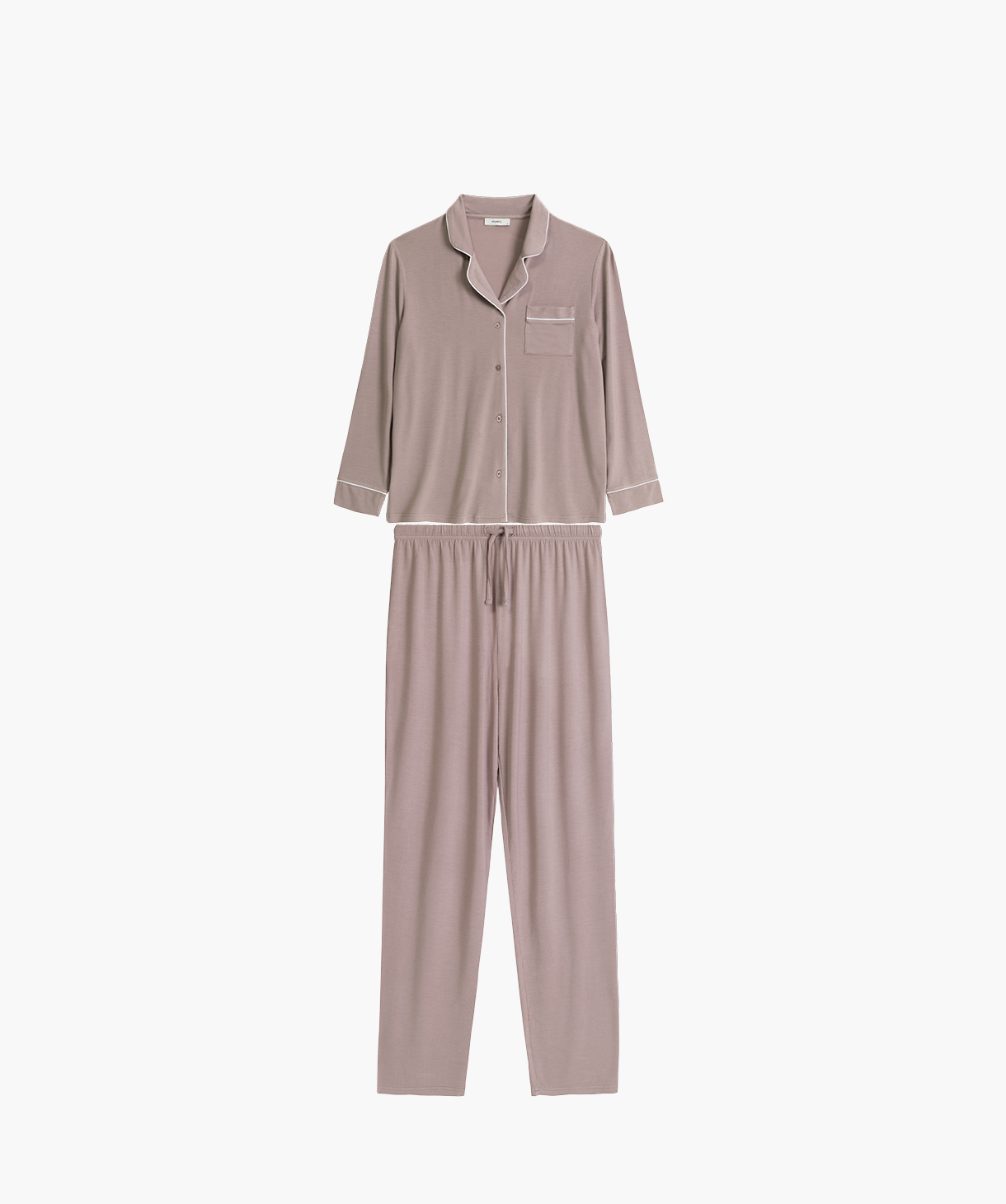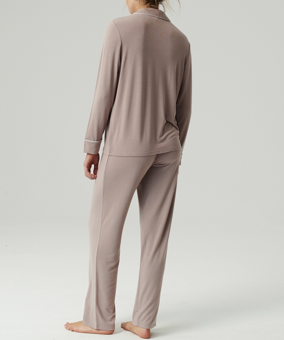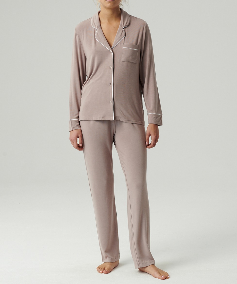 Жіноча піжама з легкого, ніжно мерехтливого модалу, надзвичайно м'яка, дихаюча та приємно прохолодна на дотик. Блузка з довгими рукавами на ґудзиках та брюки прямого крою. Склад: 95% модал, 5% еластан.