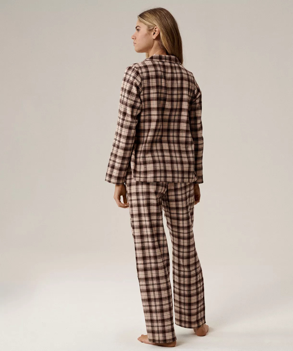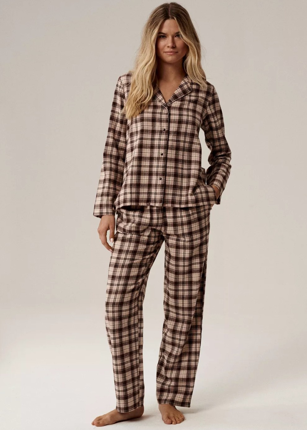 Піжама вільного крою з картатим візерунком з м'якої, приємної для шкіри бавовни. Блузка сорочкового фасону має розстібнутий комір. Штани мають бічні кишені та еластичний пояс, що не сковує рухів. Склад: 100% бавовна.