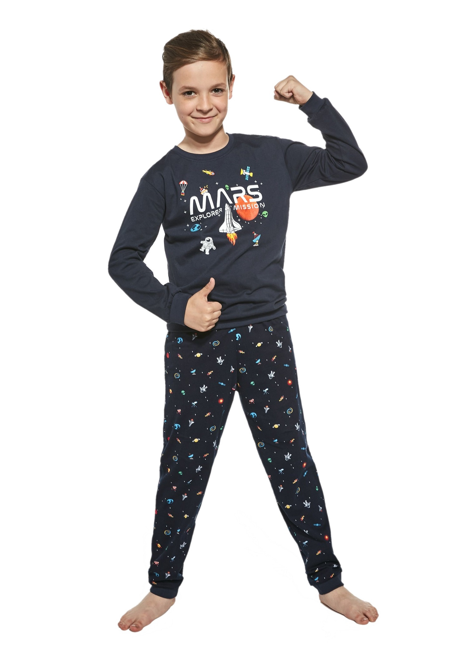 Зручна піжама для хлопчика з якісної, надзвичайно приємної та м'якої бавовни. Поділ, манжети та штанини в рубчик. Упакований в коробку. Склад: 100% бавовна.