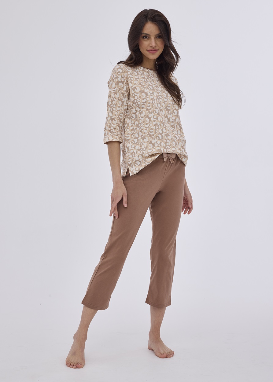 Жіноча піжама з високоякісної бавовни. Сорочка з візерунком, круглим вирізом і рівномірною окантовкою, рукав 3/4. Формені брюки 7/8, зав'язані на талії атласною стрічкою. Склад: 100% бавовна.