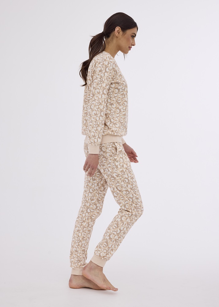 Жіноча піжама з якісної бавовни з ніжним бежевим малюнком. Футболка з довгим рукавом. Довгі брюки зі зручними кишенями, еластичний пояс. Манжети, низ сорочки і штанини оброблені манжетами. Склад: 100% бавовна.