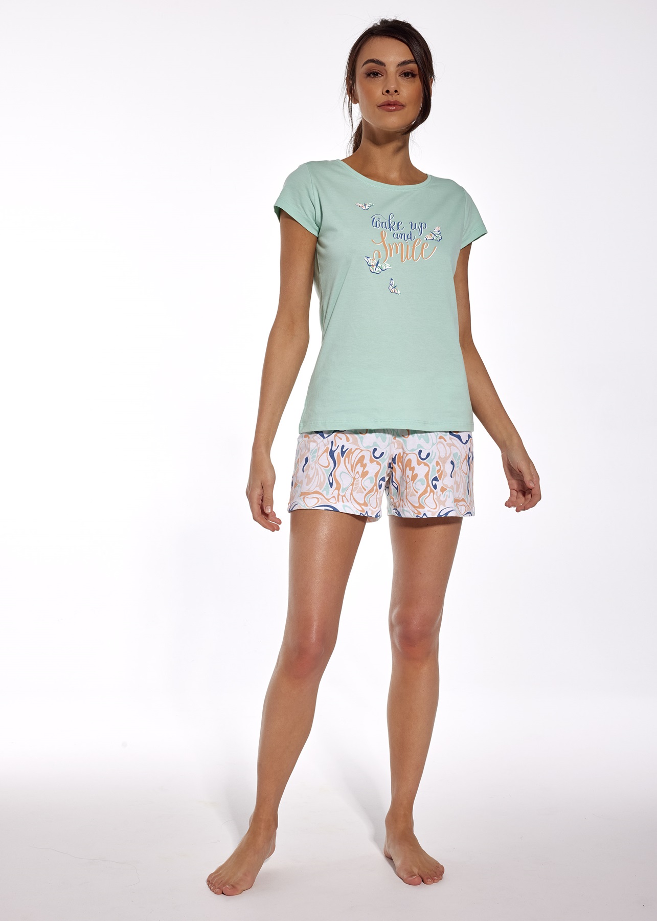 Жіноча піжама-трійка з високоякісної бавовни. Футболка з коротким рукавом, кольоровий принт спереду. У комплект входить дві пари штанів короткі і міді. Склад: 100% бавовна.