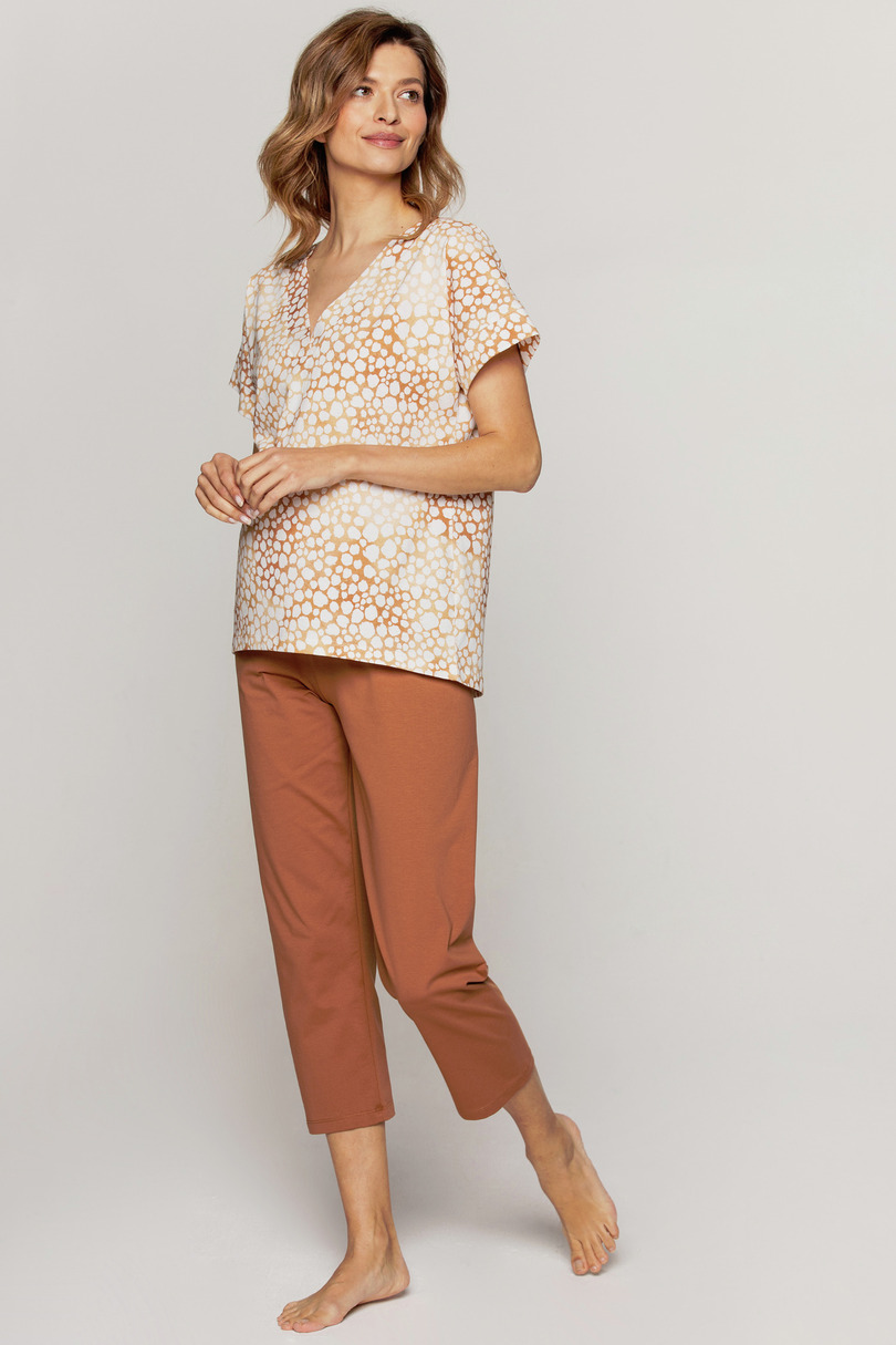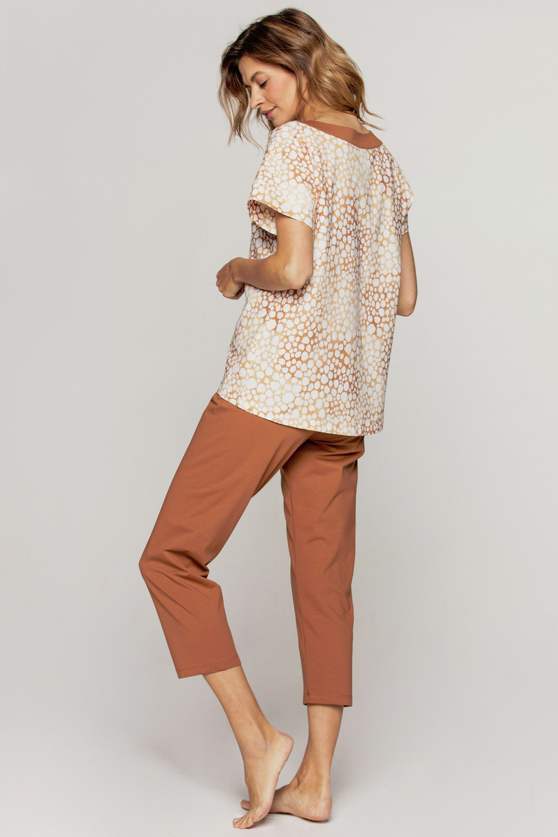 Жіноча піжама з високоякісної трикотажної тканини з сучасним візерунком «верблюд». Гарно виготовлена з максимальною увагою до деталей. Цифровий друк. Верх має вільний, зручний крій з V-подібним вирізом. Штани довжиною 3/4 у пасують до талії. Склад: верх: 95% бавовна, 5% еластан, штани: 100% бавовна