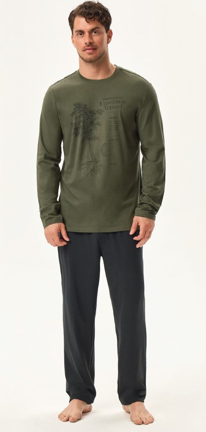 Чоловіча піжама з високоякісної бавовни. Толстовка з довгим рукавом і напівкруглим вирізом, з принтом спереду. Довгі штани контрастного кольору, резинка на талії. Склад: 100% бавовна.