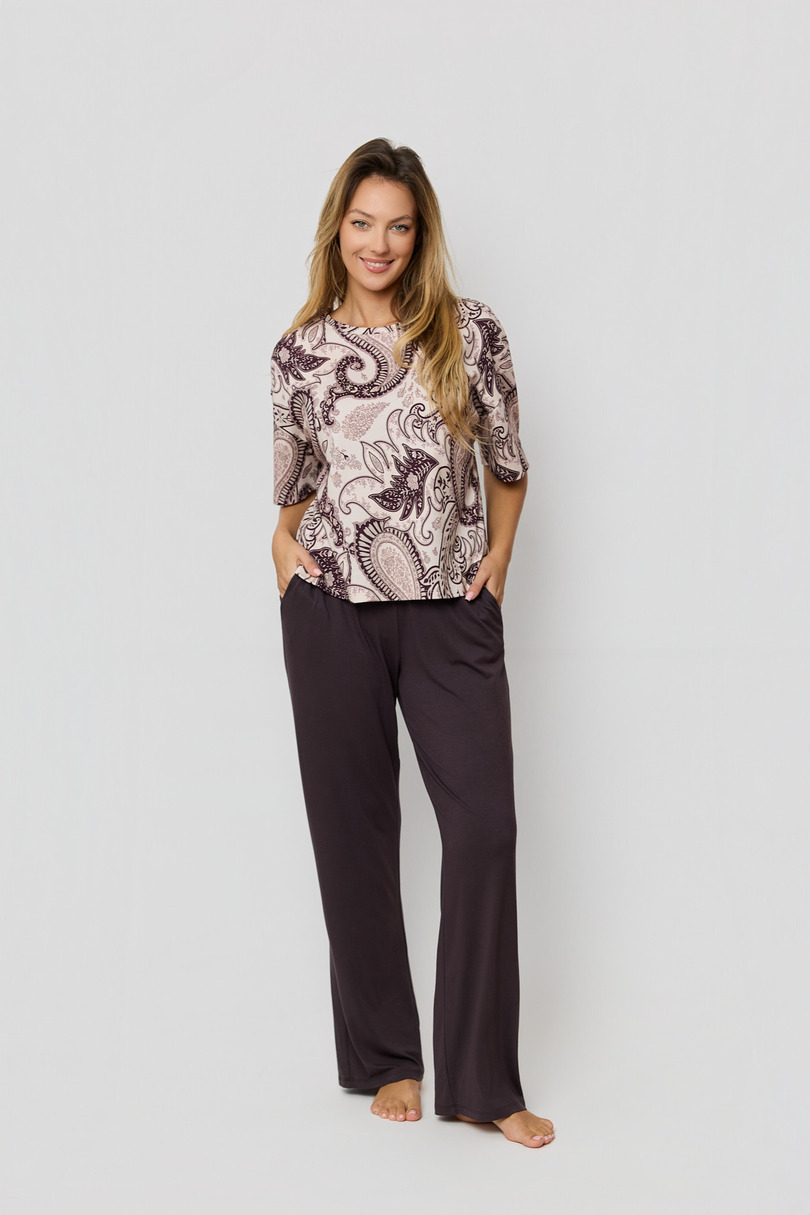 Зручна та стильна жіноча піжама з високоякісного трикотажу – ідеальний вибір для жінок, які цінують комфорт та модний вигляд. Легка, повітряна футболка з короткими рукавами прикрашена східним принтом, що надає виробу унікального характеру. Круглий виріз горловини підкреслює жіночну лінію декольте, забезпечуючи вільну та комфортну посадку. Комплект включає довгі штани з практичними кишенями, виготовлені з м’якої, еластичної віскози, яка адаптується до фігури та гарантує комфорт протягом усієї ночі. Комплект ідеально підходить як для літа, так і для прохолодних вечорів. Піжама упакована в поліетиленовий пакет – також чудово підійде як подарунок.