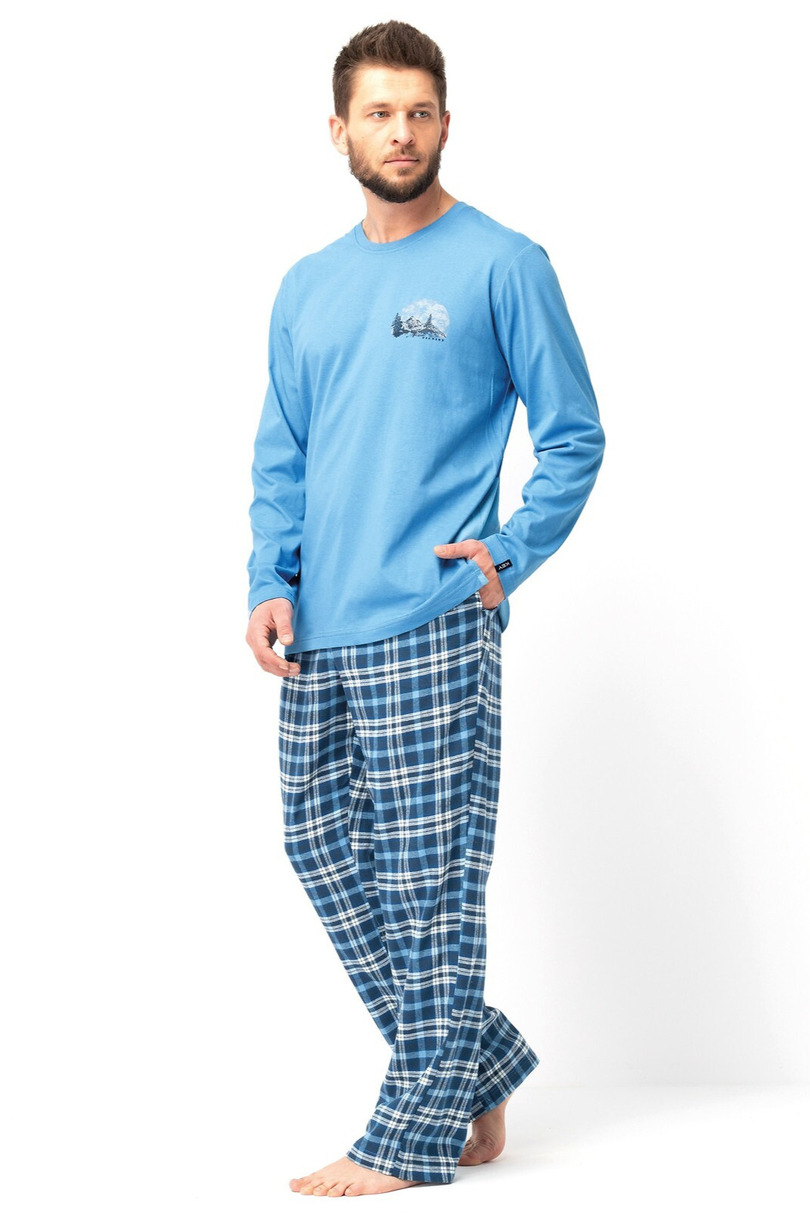 Тепла чоловіча піжама, що поєднує в собі бавовняний светр та фланелеві штани. Светр має ребристий круглий виріз. Класичні штани прямого крою мають зручний, м'який еластичний пояс. Застібаються спереду на ґудзики. Тканина: 100% бавовна.
