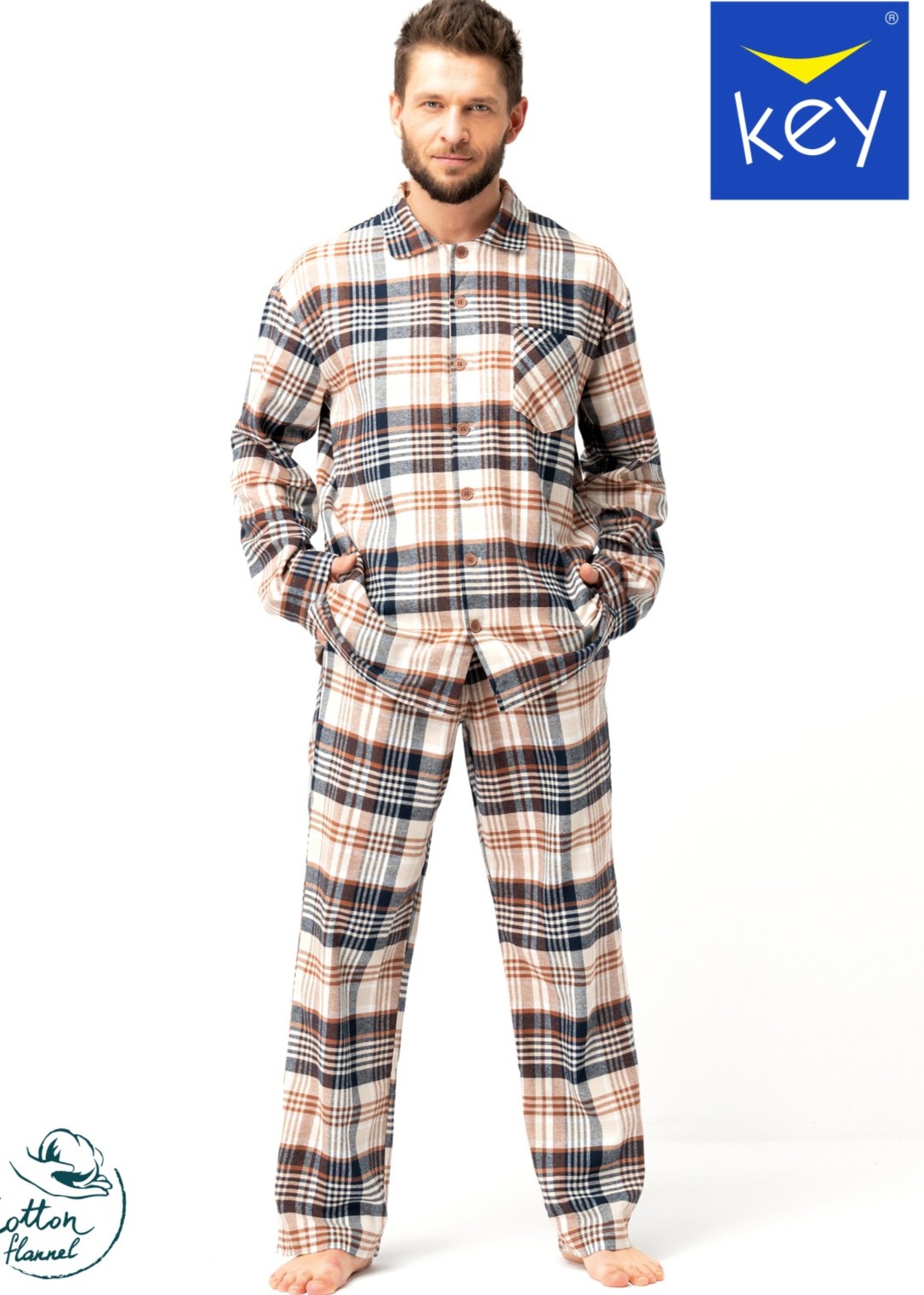 Чоловіча фланелева піжама MNS 443 ідеально підходить для чоловіків, які цінують комфорт та позачасовий стиль. Виготовлена з м'якої натуральної фланелевої бавовни, вона забезпечує оптимальне тепло в прохолодні ночі, залишаючись м'якою та повітропроникною. Класичний верх сорочки на ґудзиках має елегантний комір та нагрудну кишеню. Штани прямого крою з еластичним поясом забезпечують свободу рухів та зручну посадку. Бежево-темно-синій візерунок у клітинку додає елегантності та робить цю піжаму ідеальною не лише для сну, але й для ранкового відпочинку вдома. Склад: 100% бавовняна фланель