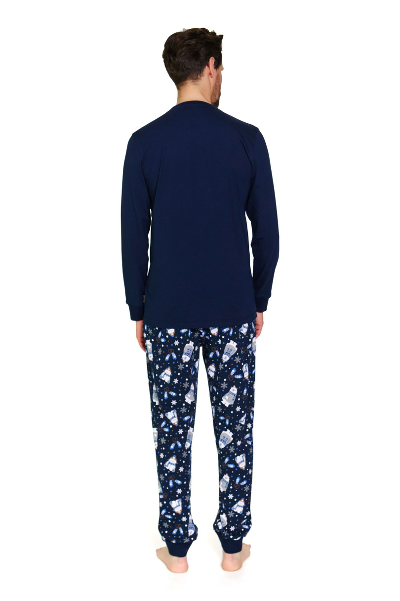 Чоловіча піжама Doctor Nap PM.7338 Cozy Bear BIG поєднує в собі класичний комфорт із сучасним дизайном. Виготовлена зі 100% високоякісної м'якої бавовни, вона забезпечує комфорт і повітропроникність протягом усієї ночі. Футболка з довгими рукавами у відтінках темно-синього та синього прикрашена грайливим принтом ведмедика, що надає їй унікального характеру. Комплект включає довгі штани з практичними кишенями, що робить піжаму не тільки зручною, але й функціональною. Класичний крій гарантує свободу рухів і ідеально підходить як для сну, так і для відпочинку вдома.
