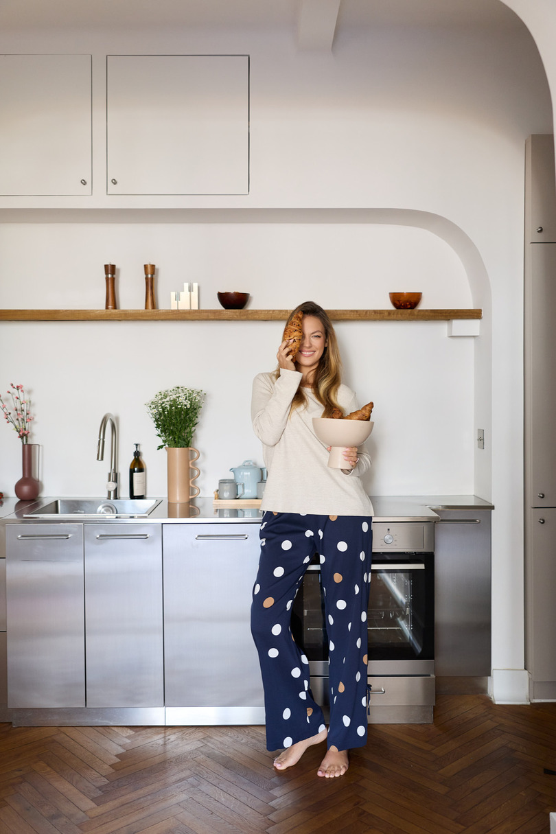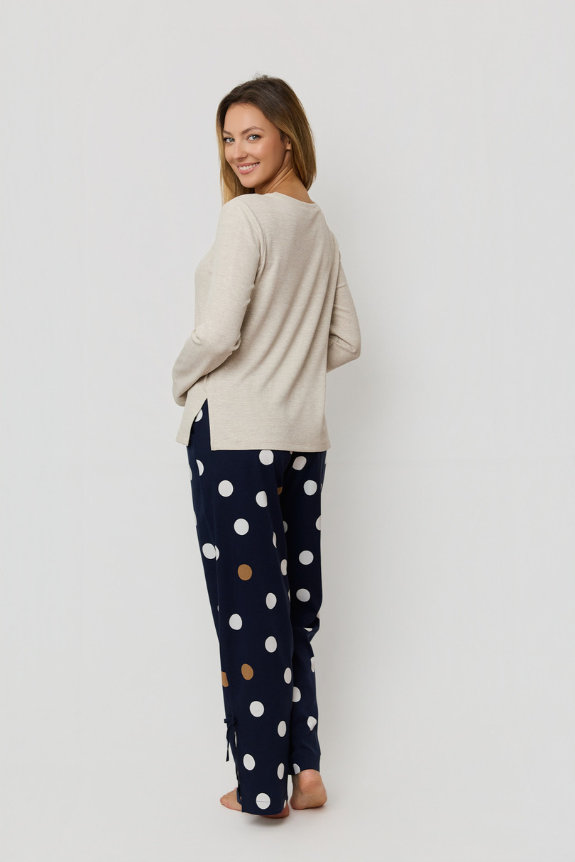 Елегантна та неймовірно жіночна жіноча піжама Oceane – це ідеальне поєднання комфорту, стилю та якості. Виготовлена з м’якої віскози, вона забезпечує комфорт та свободу рухів протягом усієї ночі. Верх – ребриста футболка з довгими рукавами, круглим вирізом горловини та ледь помітними боковими розрізами. Комплект включає довгі віскозні штани, прикрашені модним принтом у горошок. Штани мають кишені на стегнах та розрізи по низу штанин, оздоблені чарівними бантами. Загальний вигляд стильний та елегантний, ідеально підходить як для сну, так і для відпочинку вдома. Склад: футболка 93% віскоза, 7% еластан, штани 98% віскоза, 2% еластан