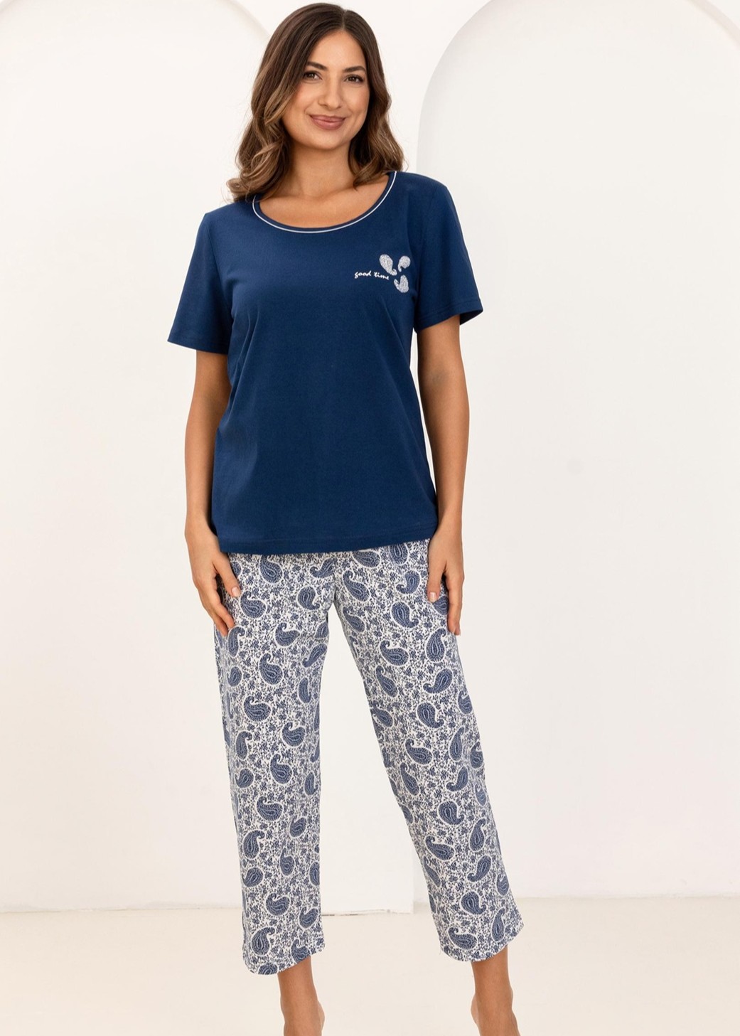 Жіноча бавовняна піжама злегка вільного крою. Футболка має короткі рукави, круглий виріз горловини та декоративний квітковий принт. Візерунчасті штани довжиною 7/8 з еластичним поясом, обробленим бавовною. Склад: 100% бавовна.