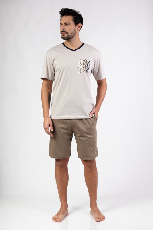 Чоловіча піжама з високоякісної бавовни. Футболка з коротким рукавом, спереду прикрашена кольоровим принтом. У комплект входять короткі однорідні шорти. Склад: 100% бавовна.