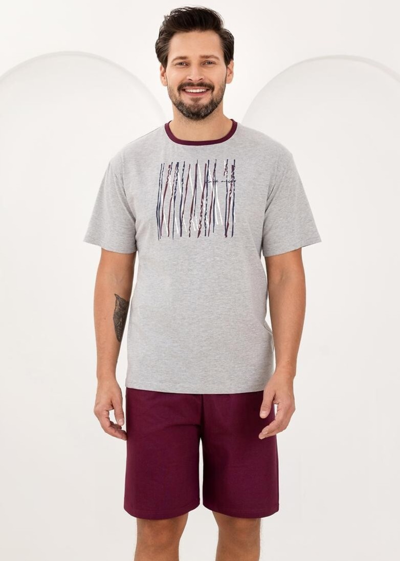 Чоловіча бавовняна піжама – м’яка, дихаюча та приємна для шкіри. Футболка з короткими рукавами, круглим вирізом горловини та принтом спереду. Однотонні шорти з еластичним поясом з бавовняною обробкою. Склад: 100% бавовна.