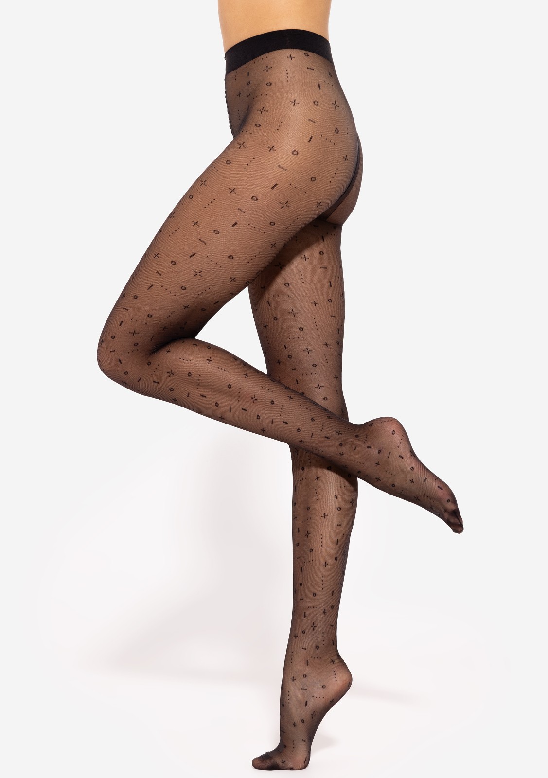 Колготки жіночі 20 ден з плетеної еластанової пряжі, матові, з малюнком. Делікатні підсилення на пальцях, без видимої частини трусиків, невелика ластовица. Склад: 89% поліамід, 11% еластан.