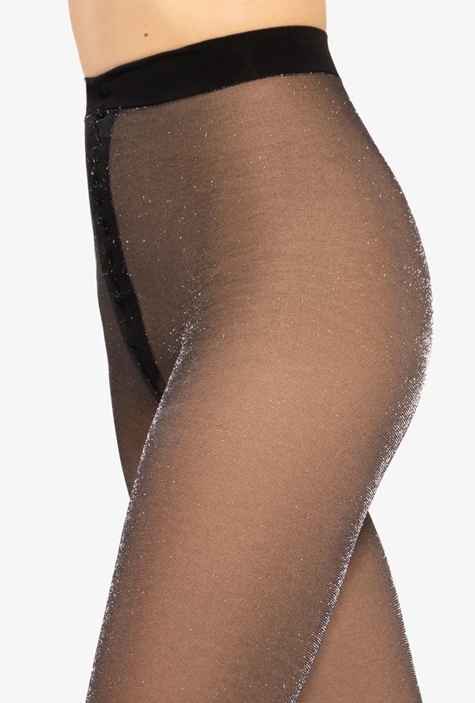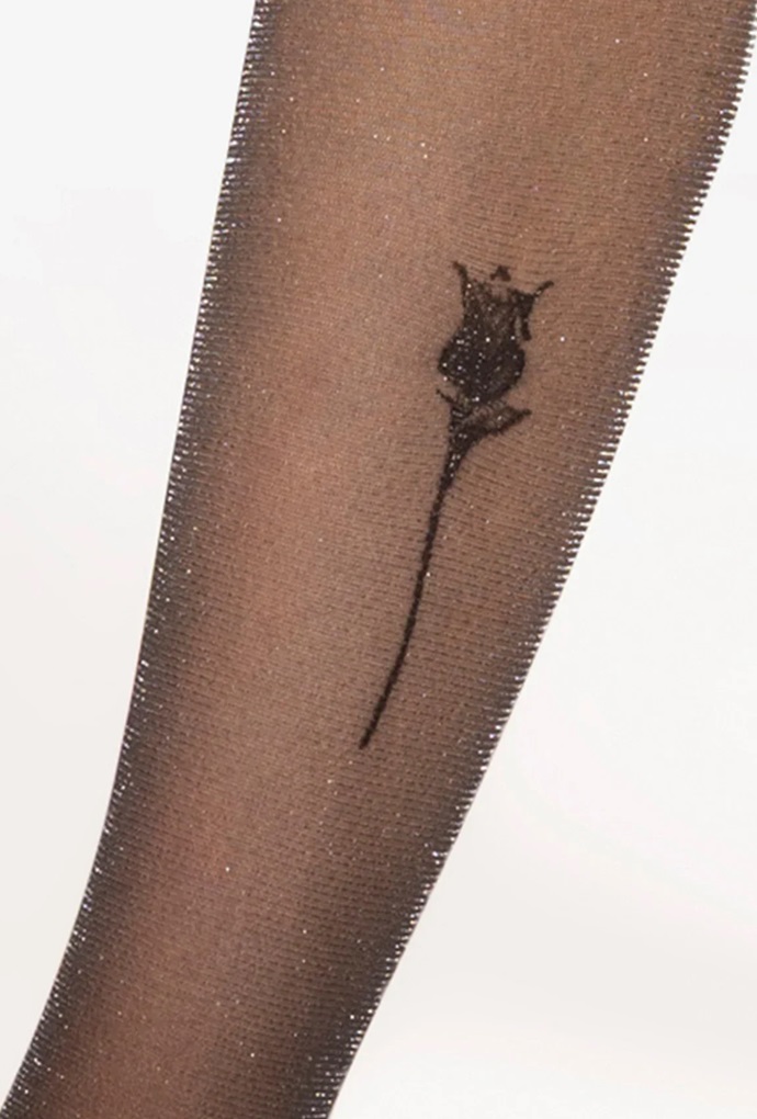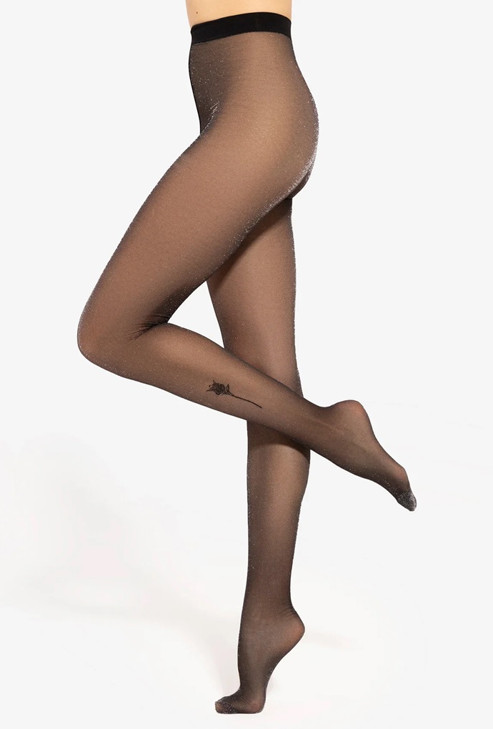 Блискучі жіночі колготки, прозорі з ніжним квітковим візерунком вище щиколотки. Склад: 73% поліамід, 23% металізоване волокно, 4% еластан.