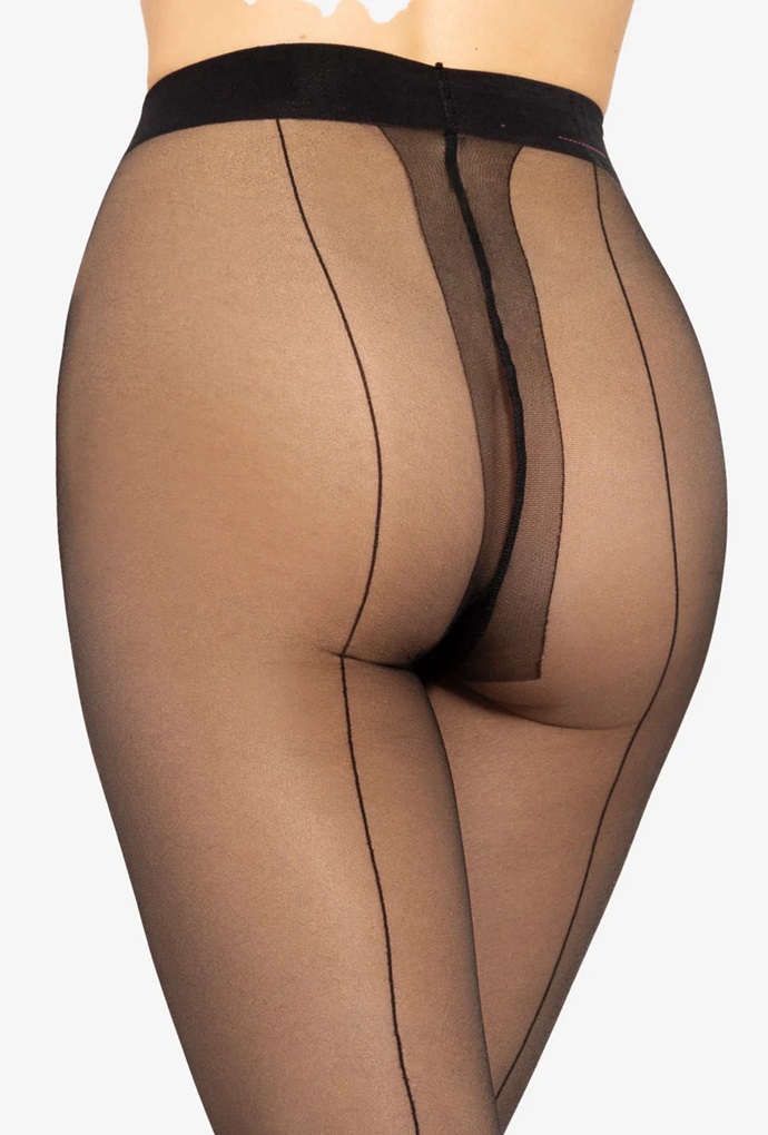 Чуттєві та витончені – чорні жіночі колготки зі швом та непомітним бантом. Вертикальний шов візуально видовжує ноги. Колготки мають чітко виражену частину для пальців та Т-подібну частину для трусиків. Склад: 86% поліамід, 13% еластан, 1% металізоване волокно.
