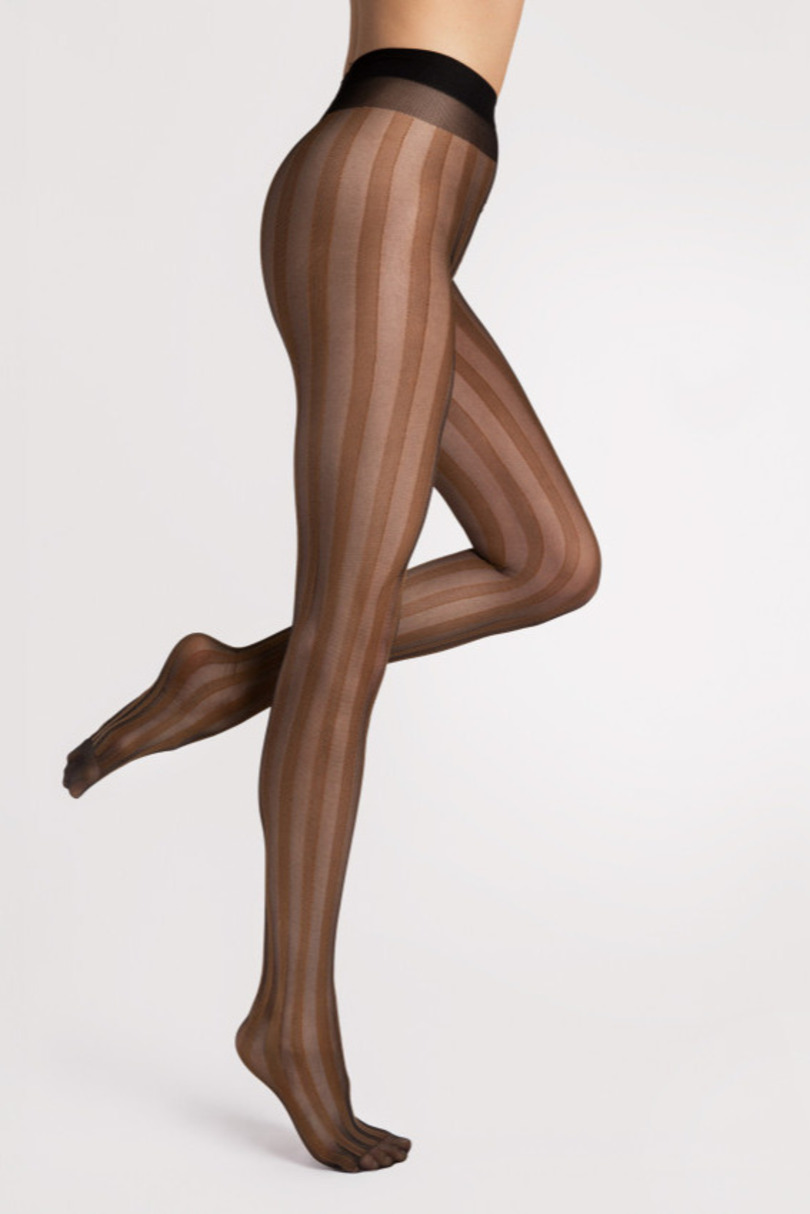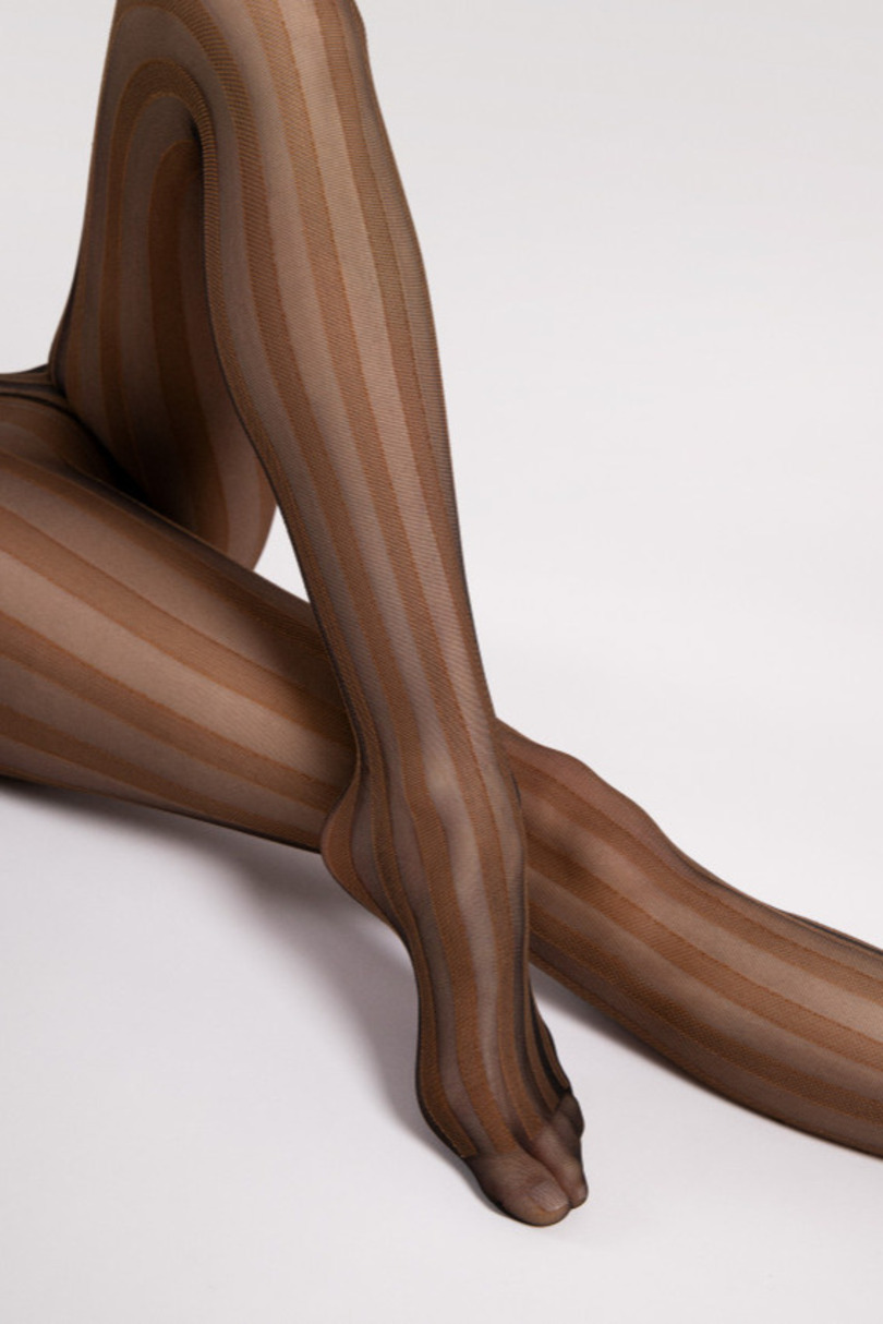 Колготки з графічними вертикальними смужками візуально звужують ноги. Сучасний дизайн створює ефект стрункості – Т-подібна частина трусиків та візерунок по всій поверхні роблять їх ідеальними для носіння з мініспідницями та шортами. Високоякісна матова трикотажна тканина від перевірених європейських постачальників.