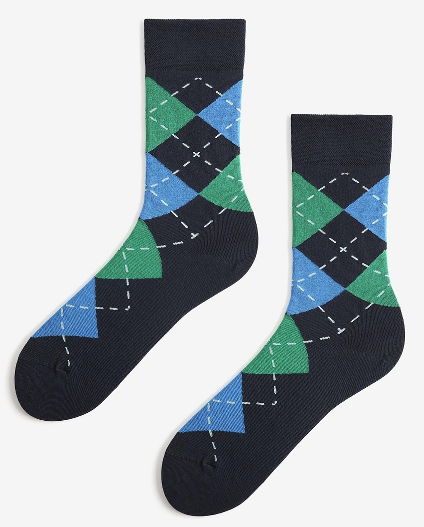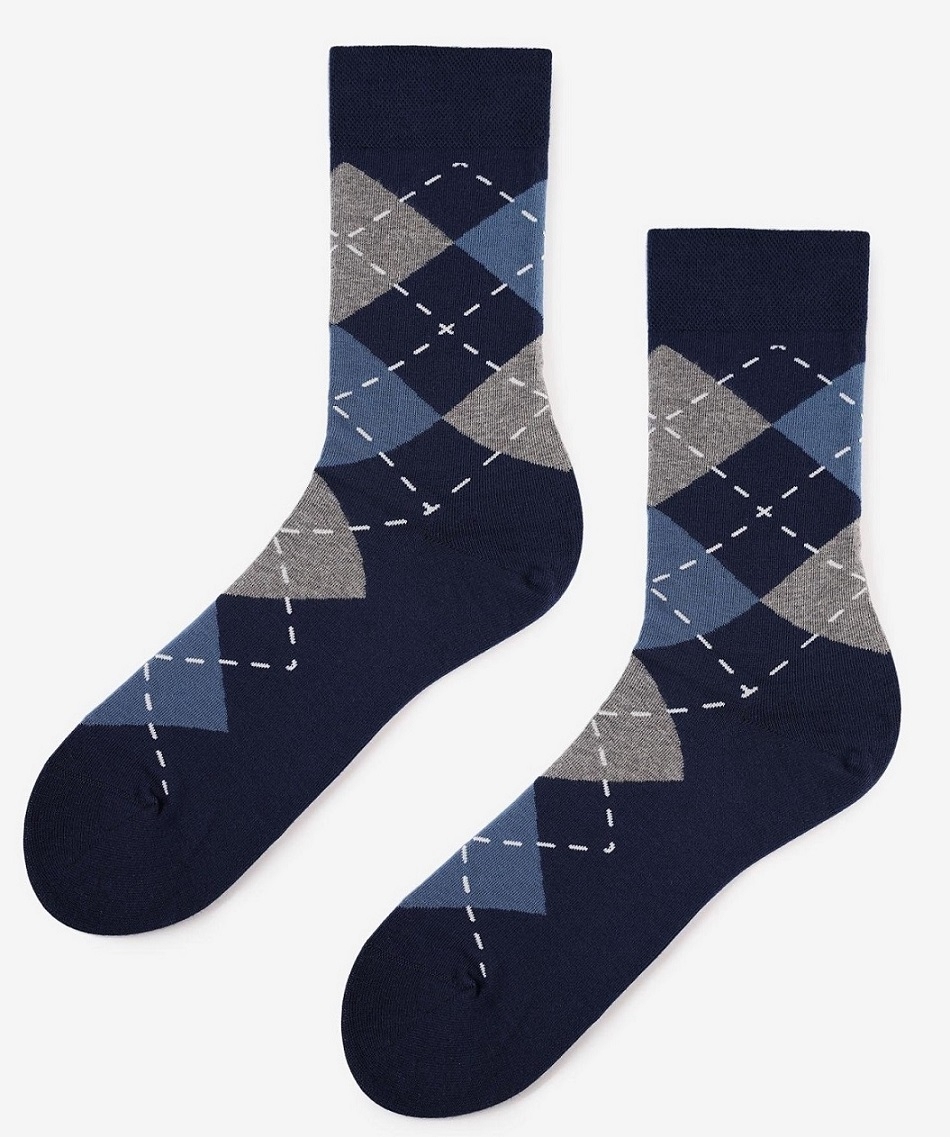 Чоловічі шкарпетки з ромбоподібним візерунком. Виготовлені з натуральної бавовни найвищої якості. Плоскі, м'які шви забезпечують комфорт. Ці шкарпетки стануть ідеальним подарунком. Склад: 80% бавовна, 15% поліамід, 5% еластан.