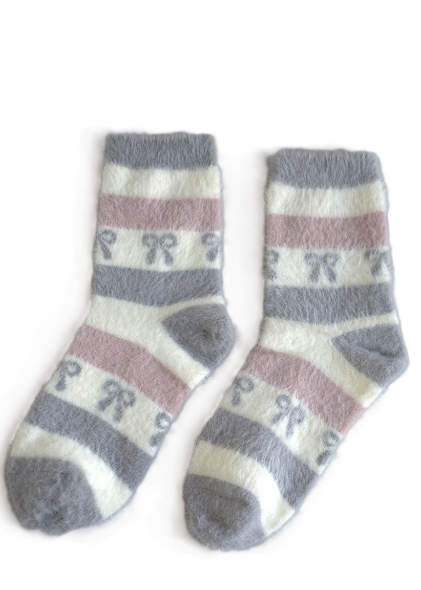 Жіночі шкарпетки з м'якої, пухкої трикотажної тканини з візерунком у смужку та бантики. Зручна, не стискаюча манжета. Склад: 86% поліамід, 12% поліестер, 2% еластан.