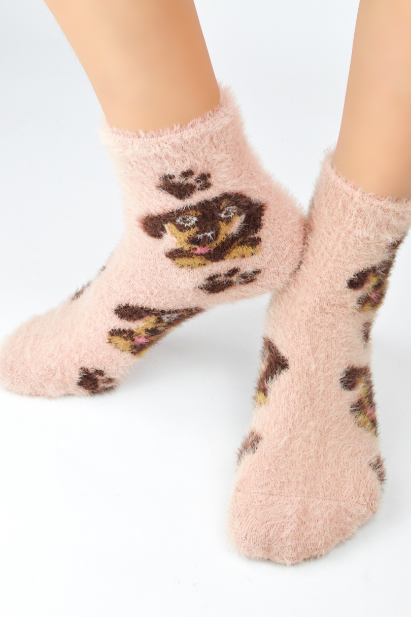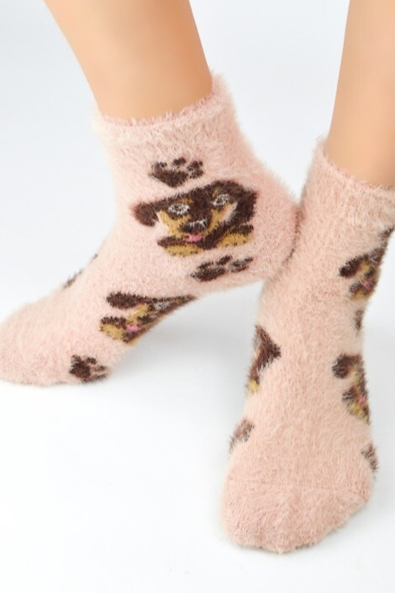 Жіночі шкарпетки з м'якої, пухкої трикотажної тканини з візерунком «собака». Зручна, не стискаюча манжета. Склад: 95% поліамід, 5% еластан.