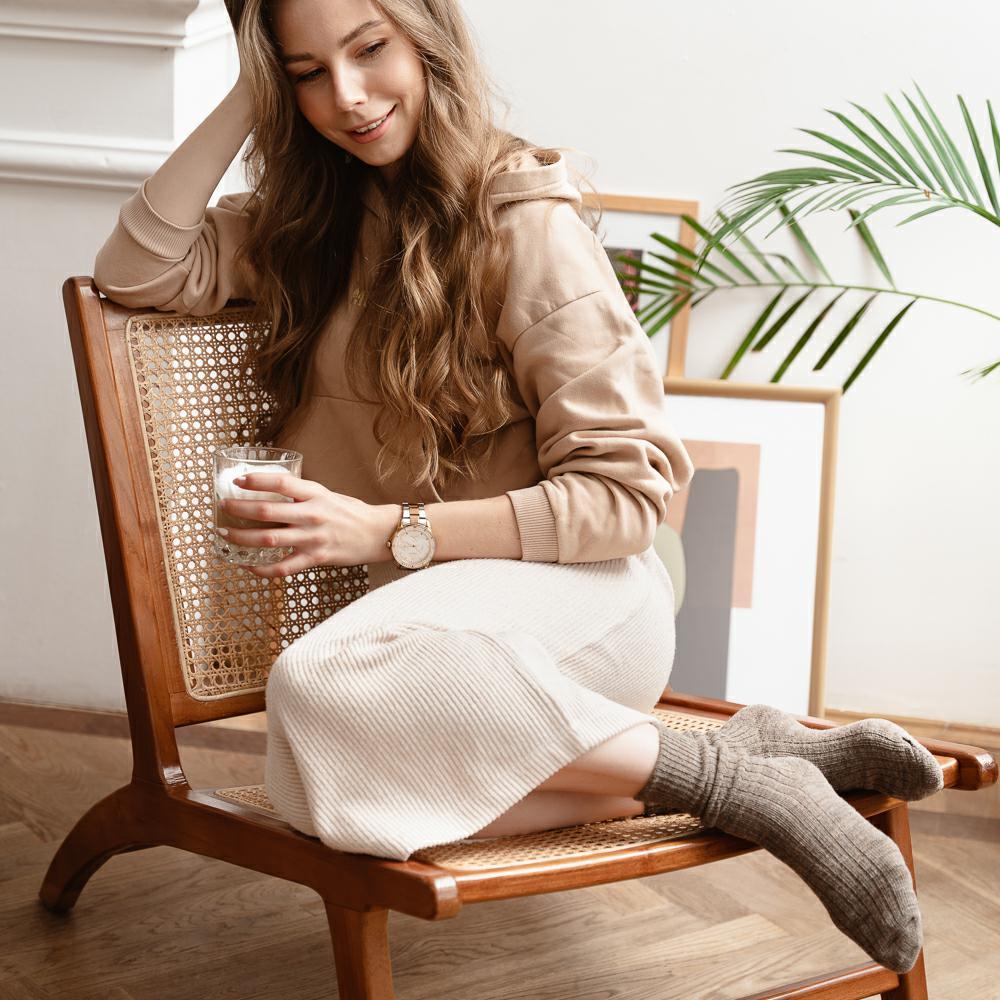 Шкарпетки з вовни альпаки, яка не вбирає запахи, має гіпоалергенні та теплоізоляційні властивості. Ребриста структура запобігає непотрібному тиску на стопу. Склад: акрил 56%, шерсть 22%, поліамід 11%, альпака 9%, еластан 2%.