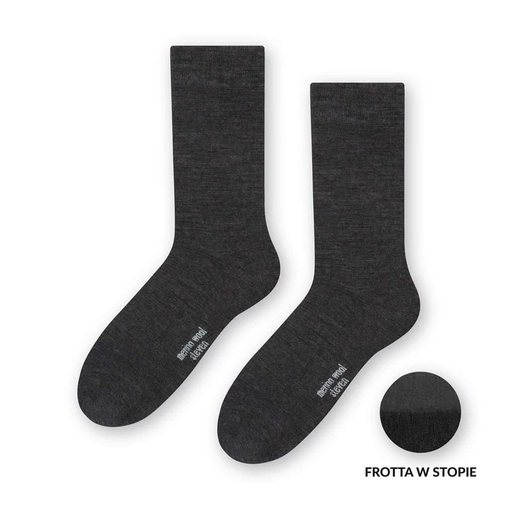Чоловічі шкарпетки з вовни мериносів. Фроте на стопі. М'які і не подразнюють шкіру. В залежності від сезону, зберігають тепло або охолоджують. Перешкоджають розвитку бактерій. Ідеальні для алергіків. Склад: 77% вовна, 21% поліамід, 2% еластан.