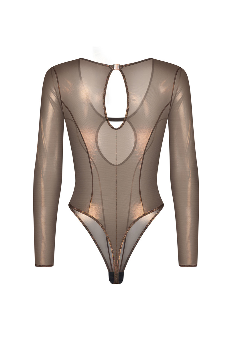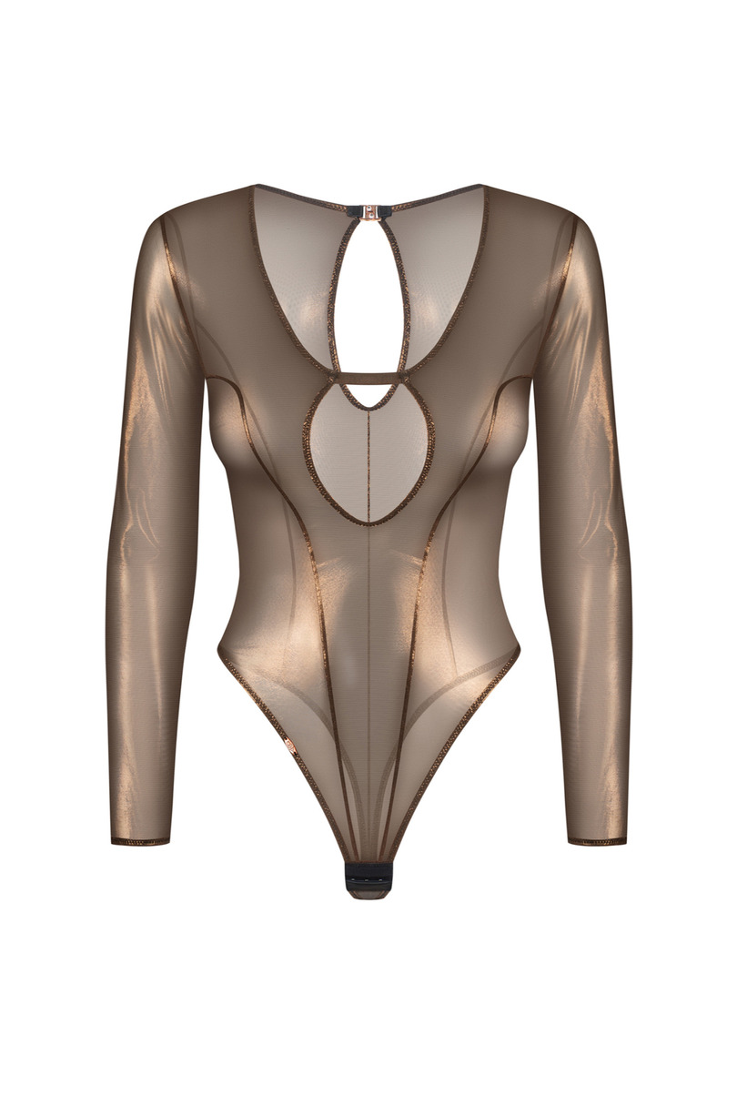 Підкресліть свою жіночність унікальним стилем з боді з довгими рукавами Soranna – чуттєвим поєднанням елегантності та ніжного блиску. Виготовлений з прозорої сітки із золотистим блиском, він ніжно огортає тіло та підкреслює його природні лінії. Довгі рукави додають нотку вишуканості, а приталений крій чудово формує силует, створюючи ефект другої шкіри. Це ідеальний вибір як для розкішної білизни, так і для яскравого вечірнього вбрання – у поєднанні з блейзером або спідницею з високою талією. Soranna – це квінтесенція жіночого шику та впевненості.