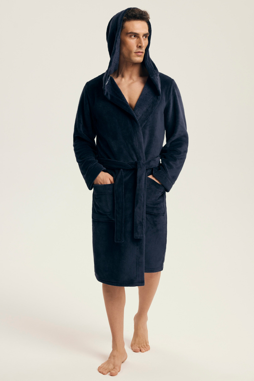 Чоловічий халат з капюшоном та зручними боковими кишенями, виготовлений з м'якої, гладкої одношарової тканини, ідеально підходить як для дому, так і для ванни. Класичний стиль із зав'язкою на талії. Склад: 100% поліестер.