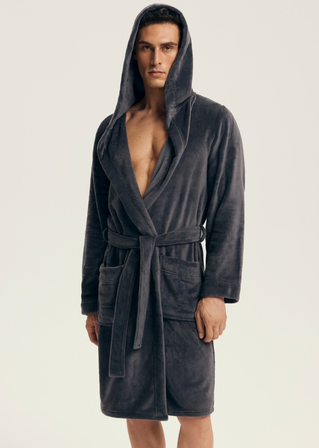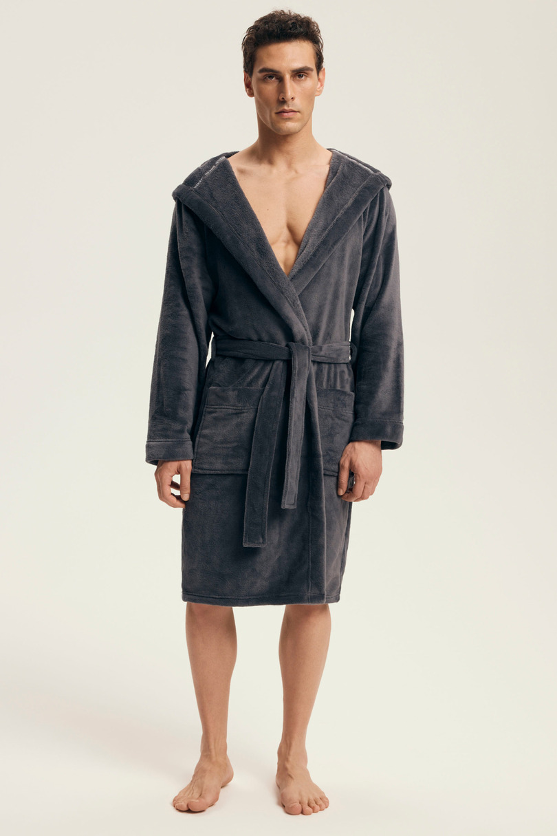 Чоловічий халат з капюшоном та зручними боковими кишенями, виготовлений з м'якого та ніжного матеріалу, ідеально підходить для відпочинку вдома або після купання. Класичний дизайн із зав'язкою на талії. Склад: 100% поліестер.