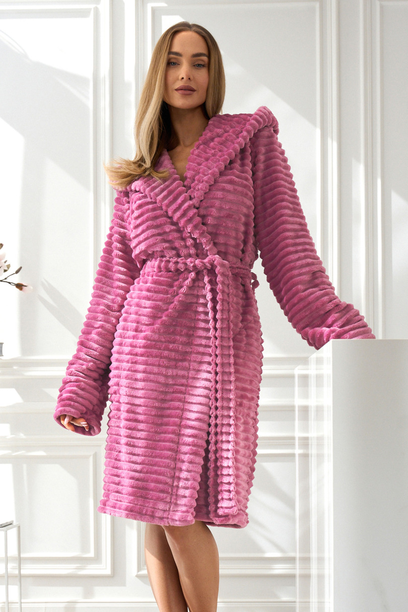 Жіночий короткий халат з капюшоном виготовлений з м'якої, теплої трикотажної тканини з тисненням у рельєфні горизонтальні смужки. Має зав'язку на талії, зручні бічні кишені та довгі рукави. Склад: 100% поліестер.