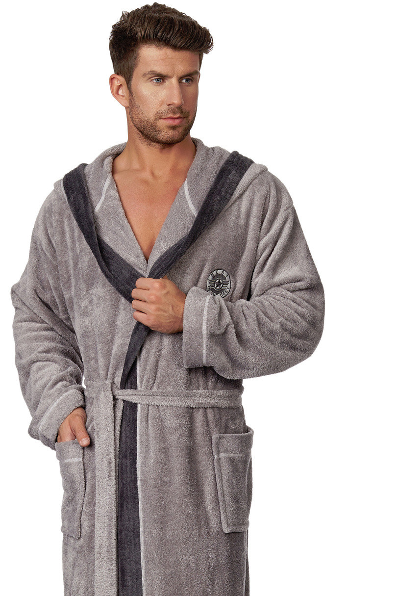 Чоловічий халат з капюшоном, що зав'язується на талії, виготовлений з м'якого трикотажу. На грудях нашита аплікація. Склад: 100% поліестер