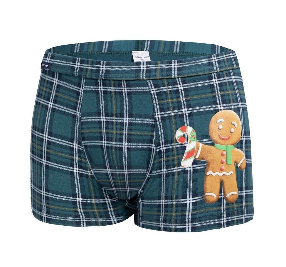 Чоловічі шорти з високоякісної бавовни прикрашені новорічним принтом. Упакований в декоративну коробку, ідеально підходить на подарунок. Склад: 95% бавовна, 5% еластан.