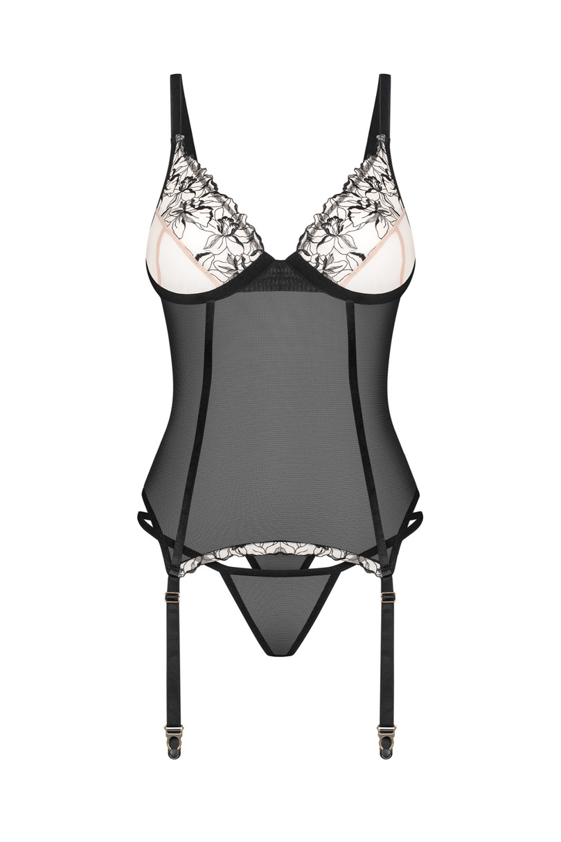 Комплект корсета та стрінгів Vila Blanes – це надзвичайно чуттєвий комплект білизни, що поєднує елегантність зі сміливим, сучасним характером. Прозора тканина ніжно відкриває фігуру, а квіткова вишивка додає розкішного штриха. Приталений крій м’яко облягає талію, чудово підкреслюючи жіночні вигини та впевненість у собі. Корсет має чашечки на кісточках, які ніжно формують груди та забезпечують стабільність. Ефектна шнурівка ззаду привертає увагу та дозволяє індивідуально підібрати фігуру, а регульовані бретельки та застібка на гачки гарантують комфорт. Регульовані незнімні бретельки для панчіх доповнюють образ, додаючи вишуканого вечірнього штриха. У комплект входять стрінги з квітковим принтом, які ідеально поєднуються з корсетом. Виготовлений з високоякісних матеріалів, розроблених у Європейському Союзі, комплект не містить нікелю, що робить його безпечним для шкіри. Це вибір для жінок, які знають, чого хочуть – розкіш, стиль та чуттєвість у найкращому вигляді.