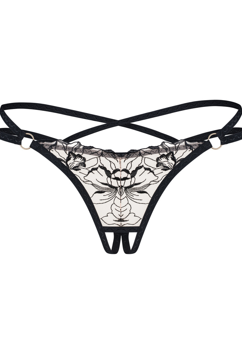 Стрінги Vila Blanes з відкритим спереду – це сміливий та неймовірно чуттєвий варіант для жінок, які цінують білизну, що підкреслює впевненість у собі та жіночність. Виготовлена з прозорої сітки, ця модель полонить ніжною квітковою вишивкою на тюлі, додаючи їй елегантності та розкоші. Дизайн з відкритим спереду в поєднанні з ніжними чорними бретельками створює інтригуючий дизайн, який привертає увагу та пробуджує уяву. Ретельно підібрані високоякісні матеріали забезпечують комфорт, а золотисті металеві деталі підкреслюють ексклюзивний стиль колекції Vila Blanes. Це ідеальний вибір для особливих моментів – стрінги чудово поєднуються з іншими елементами колекції, створюючи цілісний, спокусливий образ. Якщо ви шукаєте білизну, яка поєднує чуттєвість, елегантність та сучасний дизайн, ця модель виправдає ваші очікування.