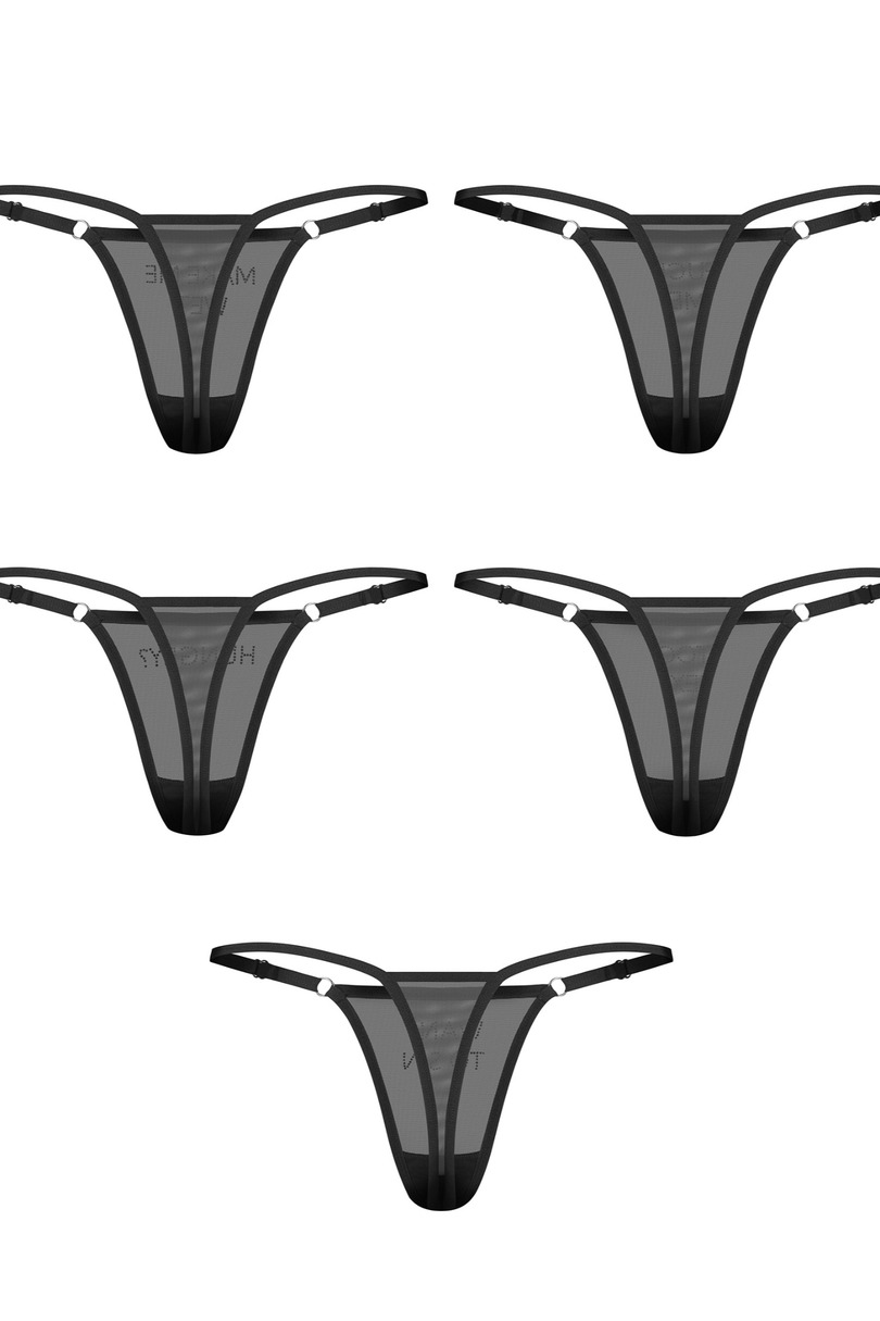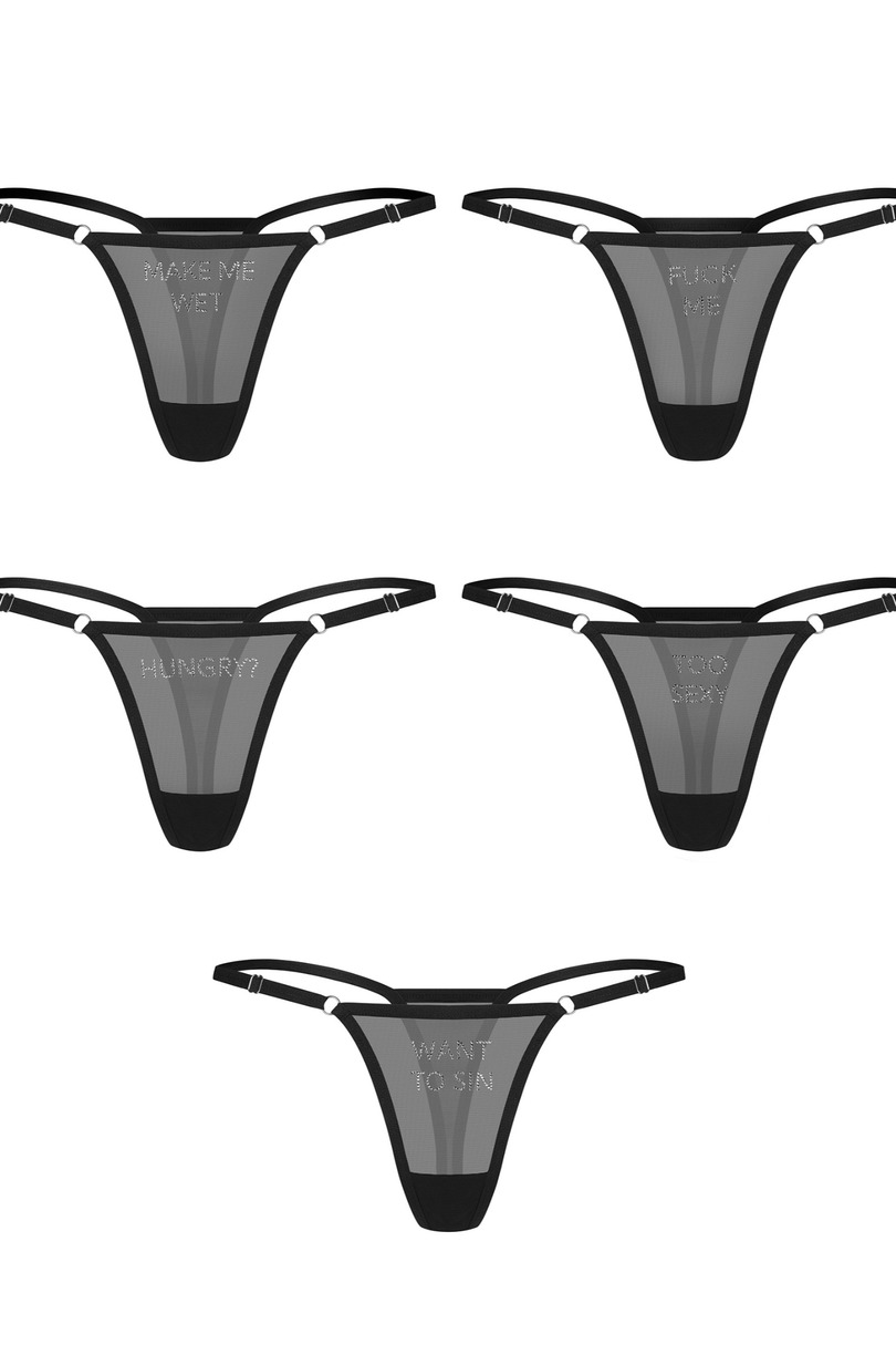 Комплект стрінгів Violami з 5 пар ідеально підходить для жінок, які люблять сміливу, чуттєву білизну та хочуть підкреслити свою впевненість у собі. Кожна модель у комплекті має різний, провокаційний напис з мерехтливих страз, які привертають увагу та додають білизні унікального характеру. Стрінги виготовлені з прозорої, м’якої сітки, яка непомітно підкреслює фігуру, залишаючись зручною та легкою. Регульовані бретельки з боків забезпечують ідеальну посадку, забезпечуючи комфорт та ідеально окреслені стегна. Цей комплект стане ідеальним подарунком або сміливим елементом гардеробу, який дозволить вам почуватися унікальною, сексуальною та впевненою — незалежно від нагоди.