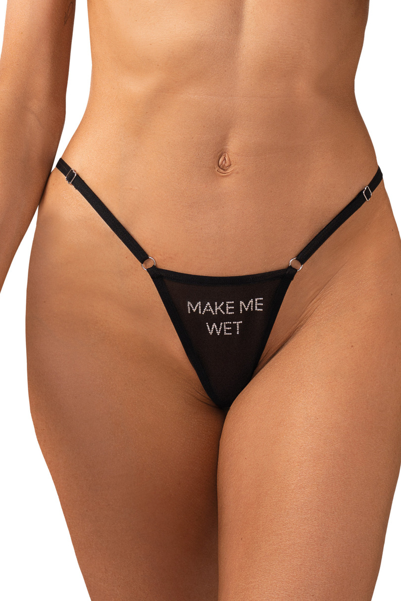 Стрінги "Make Me Wet" розроблені для жінок, які люблять провокувати та грати з чуттєвістю. Виготовлені з прозорої, легкої сітки, вони ніжно відкривають тіло, а мерехтливий напис з циркону одразу привертає увагу та нагріває атмосферу. Сміливий, грайливий дизайн поєднується з комфортом – гнучка конструкція та регульовані бретельки забезпечують ідеальну посадку, підкреслюючи стегна та надаючи силуету чуттєвого відтінку. Це ідеальний вибір для особливих вечорів, коли ви хочете додати гостроти своєму образу та створити атмосферу, яку ви незабаром забудете.