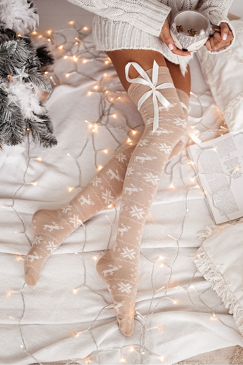 Жіночі бавовняні гольфи, прикрашені новорічним візерунком. Мають плоскі шви і манжету, що не тисне, що забезпечує зручність і комфорт носіння. Завершується декоративною стрічкою для зав’язування банта.