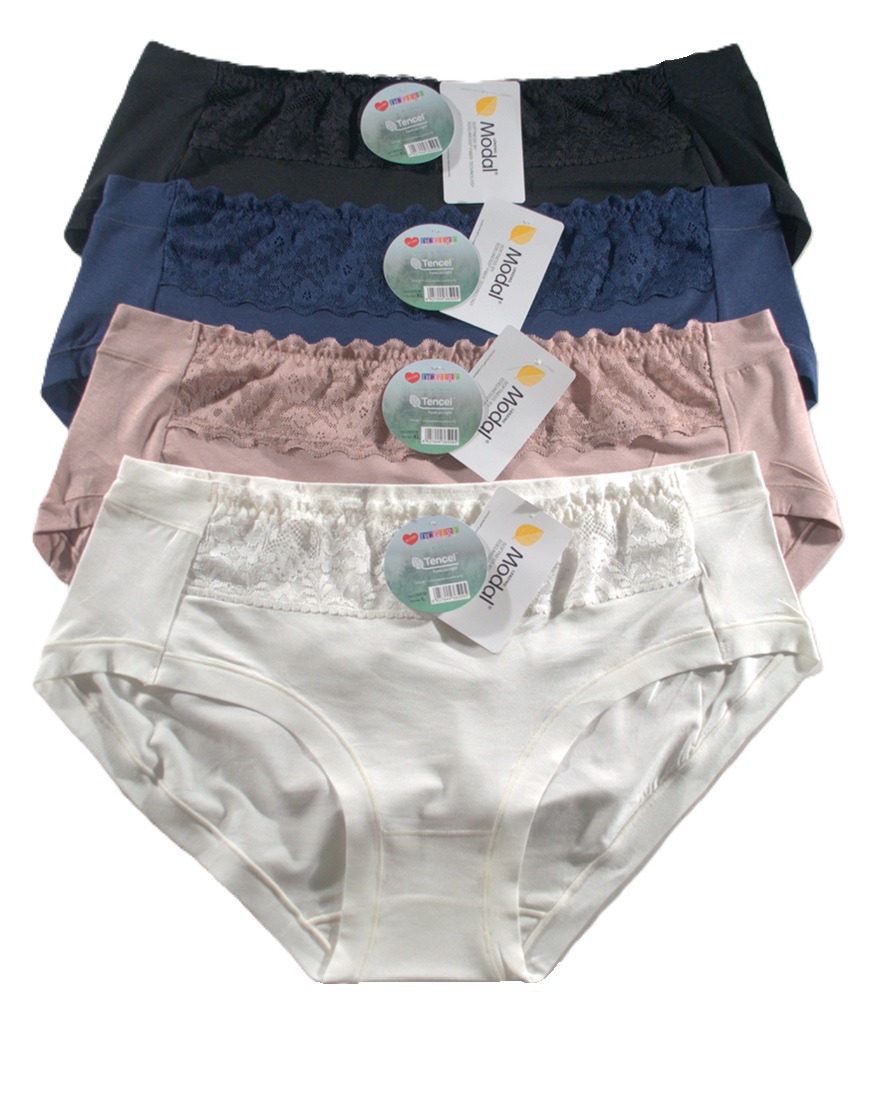 Жіночі труси з якісного м'якого модалу. Красиві стримані кольори, прикрашені мереживом. Упаковка по 12 штук в міксі кольорів. Змішані розміри в упаковці (S,M,L,XL). Склад: 94% модал, 6% еластан.