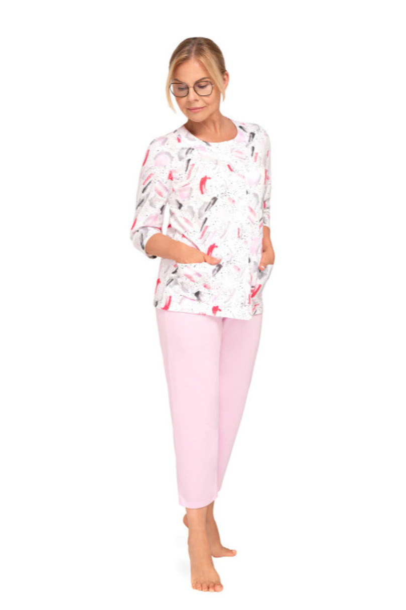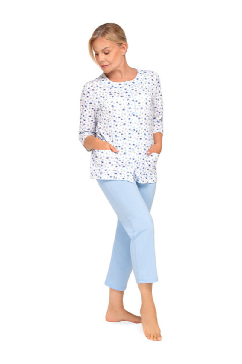 Піжама бавовняна з кишенями, застібається на гудзики, однотонні брюки, зручна гумка на талії, довжина 3/4